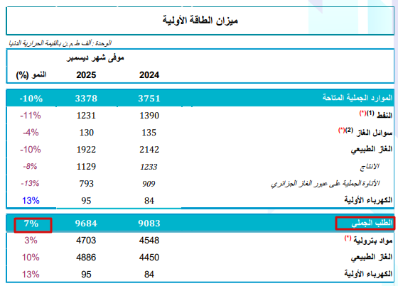 في المقابل قدرت نسبة الزيادة في استهلاك الطاقة بـ7%، أي أن نسبة الزيادة في الاستهلاك تمثل تقريبا 3 أضعاف نسبة النمو الاقتصادي بالنسبة لسنة 2025.