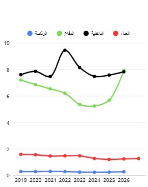 وتشير الأرقام الواردة في الجدول إلى أن ميزانيات وزارات العدل والداخلية والدفاع ورئاسة الجمهورية بين 2019 و2026 ارتفعت، إلا أن نسبتها من ميزانية الدولة أظهرت اتجاهات مختلفة، فقد شهدت العدل تراجعًا نسبيًا من 1.61% إلى 1.29% مع استقرار طفيف في السنوات الأخيرة.