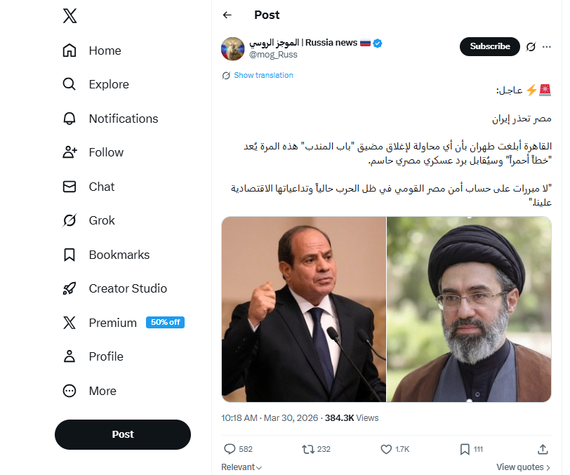 تتبع فريق "تفنيد" الأنباء المتداولة في موقعي التواصل الاجتماعي فيسبوك وإكس، بخصوص إبلاغ القاهرة طهران بأن أي محاولة لإغلاق مضيق "باب المندب" هذه المرة يُعد "خطاً أحمراً" وسيُقابل برد عسكري، يوم 30 مارس 2026، ووجد أنه "مضلل"، وذلك بالبحث في التصريحات والبيانات الرسمية للمؤسسات المصرية.