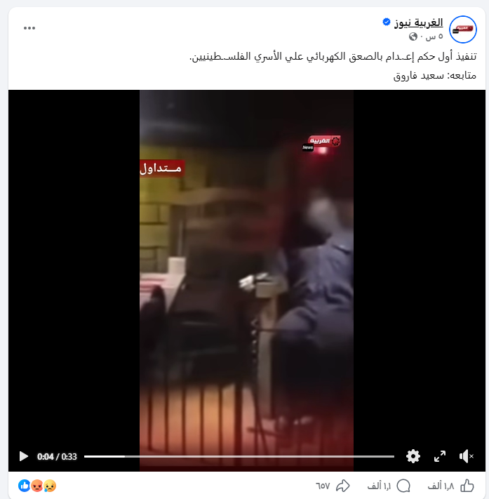 تتبع فريق "تفنيد" الأنباء المتداولة في موقعي التواصل الاجتماعي فيسبوك وإكس، بخصوص تنفيذ أول حالة إعدام بالصعق الكهربائي لأحد عناصر كتائب القسام في فلسطين، يوم 31 مارس 2026، ووجد أنه "مضلل"، وفقًا للبحث العكسي عن الفيديو.