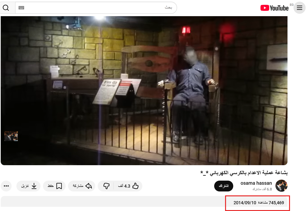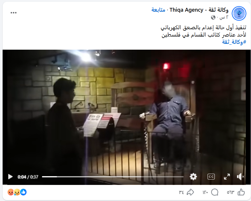 وبالبحث العكسي عن الفيديو، تبين أن المقطع منشور في سبتمبر 2014، على منصة "يوتيوب" باسم "osama hassan"، وأِشار صاحب القناة إلى أن المقطع لمحاكاة لطريقة الإعدام بالكرسي الكهربائي تعرض أمام الجمهور داخل متحف "Believe It or Not"، في ساحة بيكاديللي في لندن، والذي أغلق في 2017، وأن الفيديو من تصويره، وليس له علاقة بالأحداث الأخيرة.