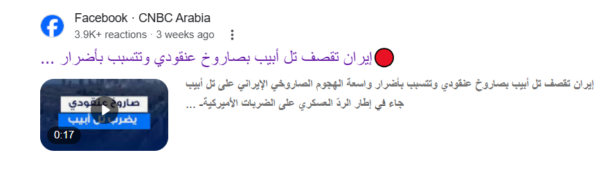 وفي سياق الاستهداف الإيراني لتل أبيب وعدد من المناطق الإسرائيلية، وإعلان ناداف شوشاني المتحدث الدولي باسم الجيش الإسرائيلي، استخدام إيران لصواريخ تحمل ذخائر عنقودية، تداولت صفحات ومواقع إخبارية يوم 3 آذار/مارس 2026، منها جريدة الشروق، وقناة CNBC عربية، وموقع تحيا مصر، مقطع فيديو يزعم استهداف تل أبيب بصاروخ إيراني ذي رأس حربي عنقودي.