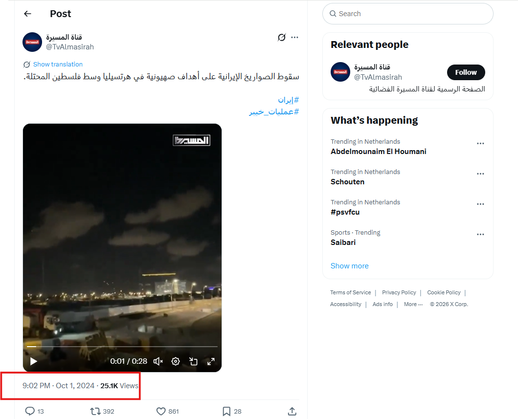 ومقطع الفيديو الثاني "قديم" ويعود إلى 1 أكتوبر 2024، للحظة سقوط صاروخ إيراني وانفجاره في هرتسليا شمالي تل أبيب، خلال هجوم بالصواريخ شنته إيران على إسرائيل، وليس له علاقة بالأحداث الأخيرة.