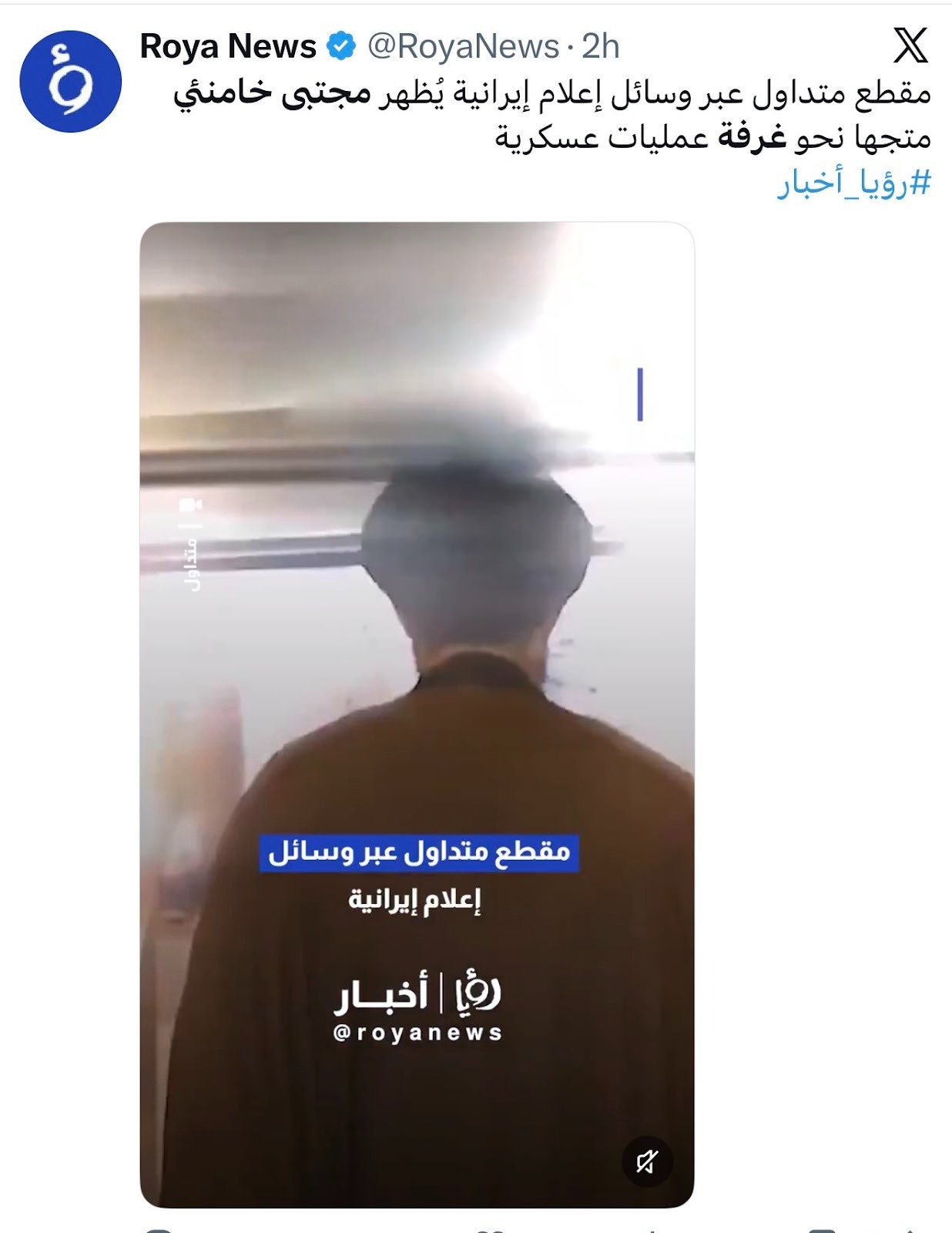 تتبع فريق "تفنيد" الفيديو المتداول على عدد من المواقع مثل "رؤيا الإخباري" وحسابات على موقعي التواصل الاجتماعي فيسبوك وإكس، والذي ادعى ناشروه أنه يرصد أول ظهور لآية الله سيد مجتبي خامنئي من داخل غرفة الحرب، وتبين أنه "مضلل"، وفقًا للبحث العكسي والفحص التقني للفيديو.