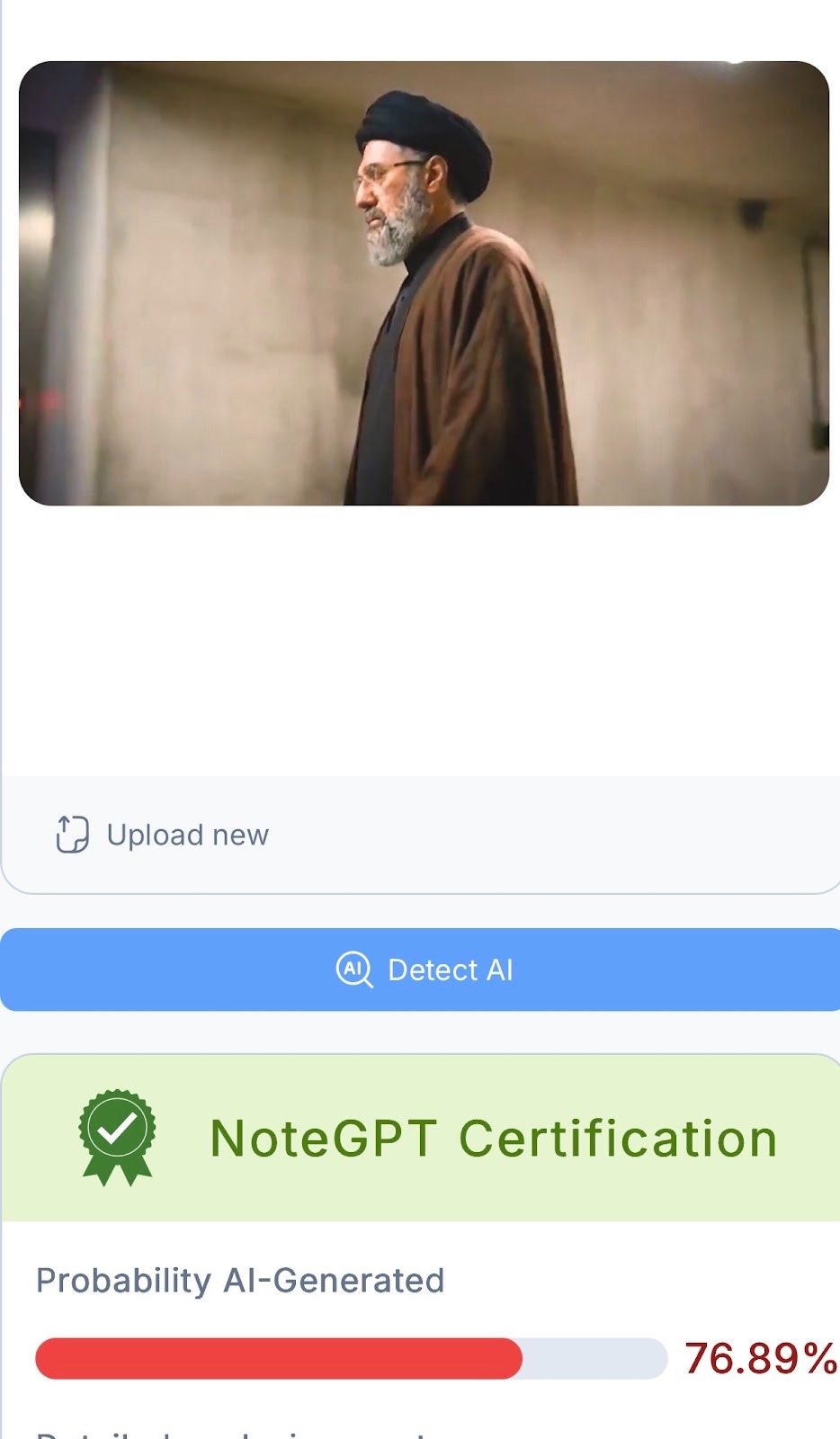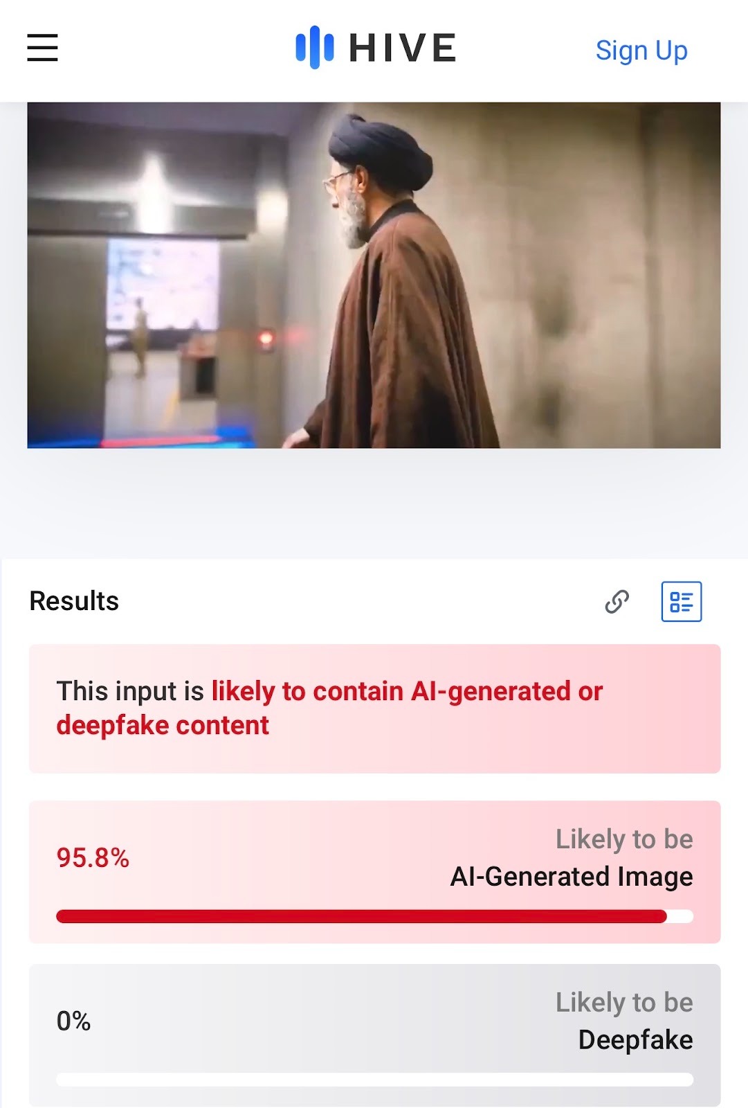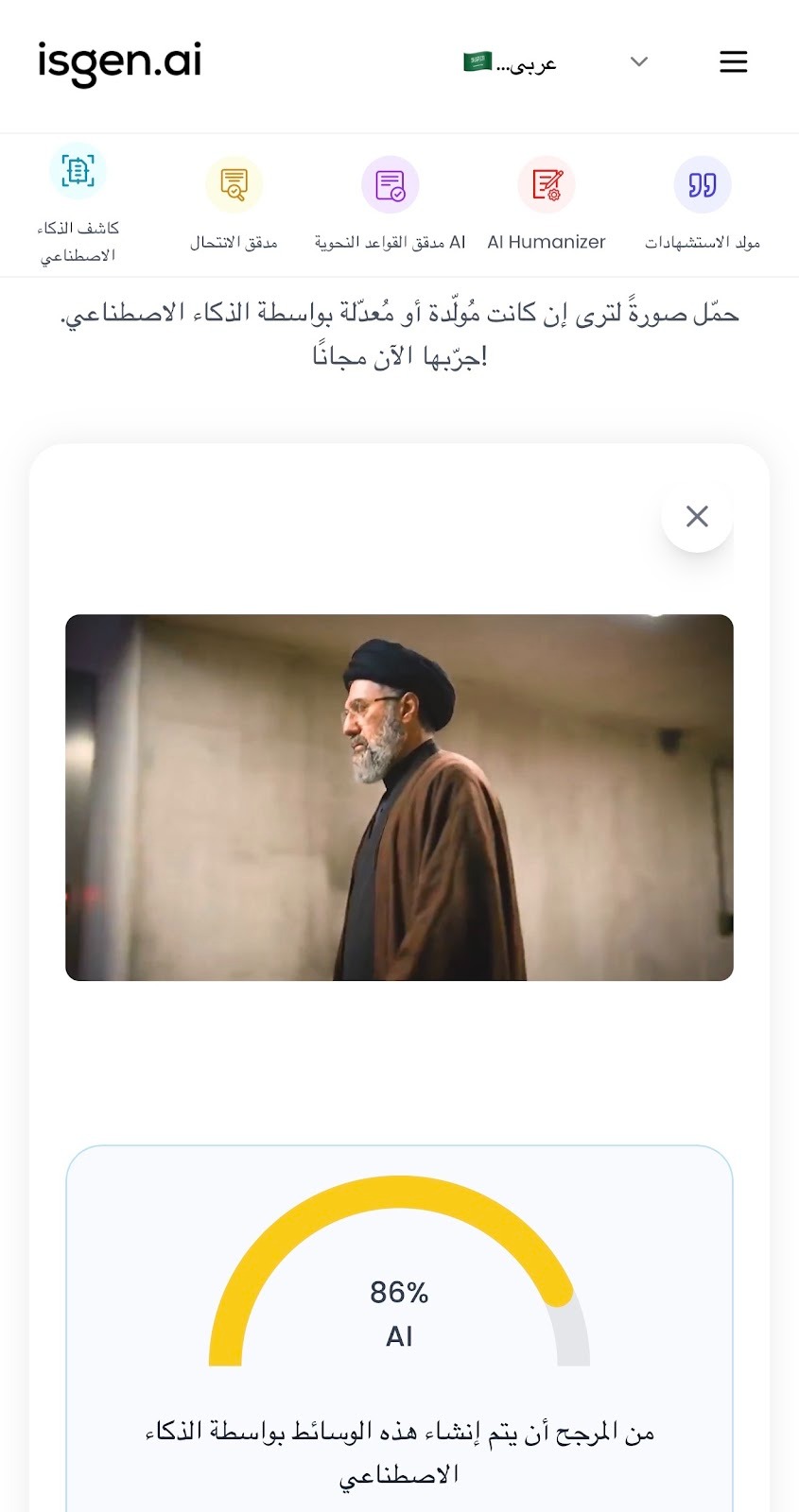 وفي خطوة ثانية استخدمنا أدوات كشف زيف الصور واتضح أنه مولد بالذكاء الاصطناعي، حيث اتفقت 3 أدوات لكشف المحتوى المولد بالذكاء الاصطناعي وهي Ai Hive moderation؛ وNote gpt، وIsgen ai على أن الجزء الأول من الفيديو والذي يظهر فيه صورة المرشد آية الله خامنئي مولد بالذكاء الاصطناعي، ولكن باقي الفيديو يبدو حقيقيًا.