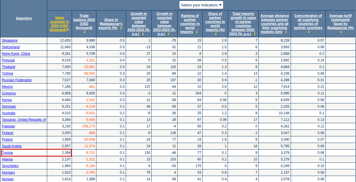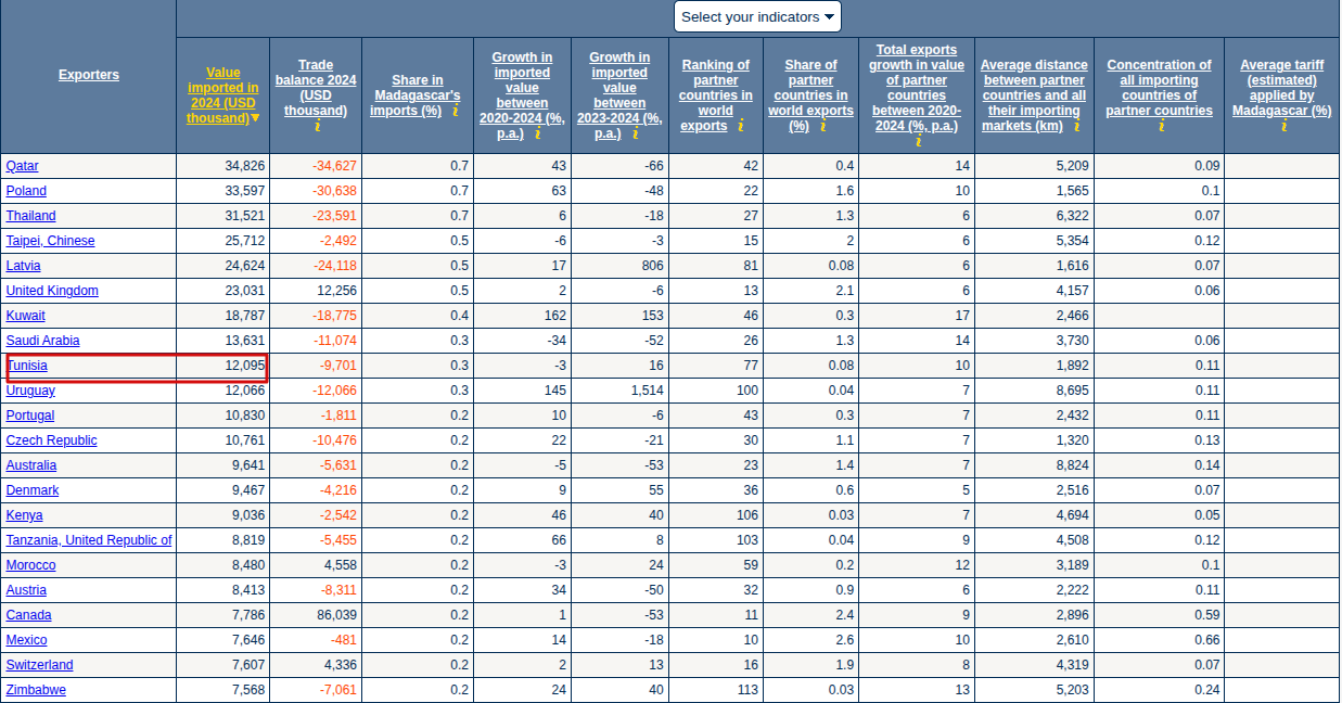 وTrade Map هي قاعدة بيانات على الإنترنت لإحصاءات التجارة الدولية يوفرها مركز التجارة الدولية. وقد ذكر المصدر أن صادرات تونس نحو مدغشقر بلغت 12 مليون دولارًا.