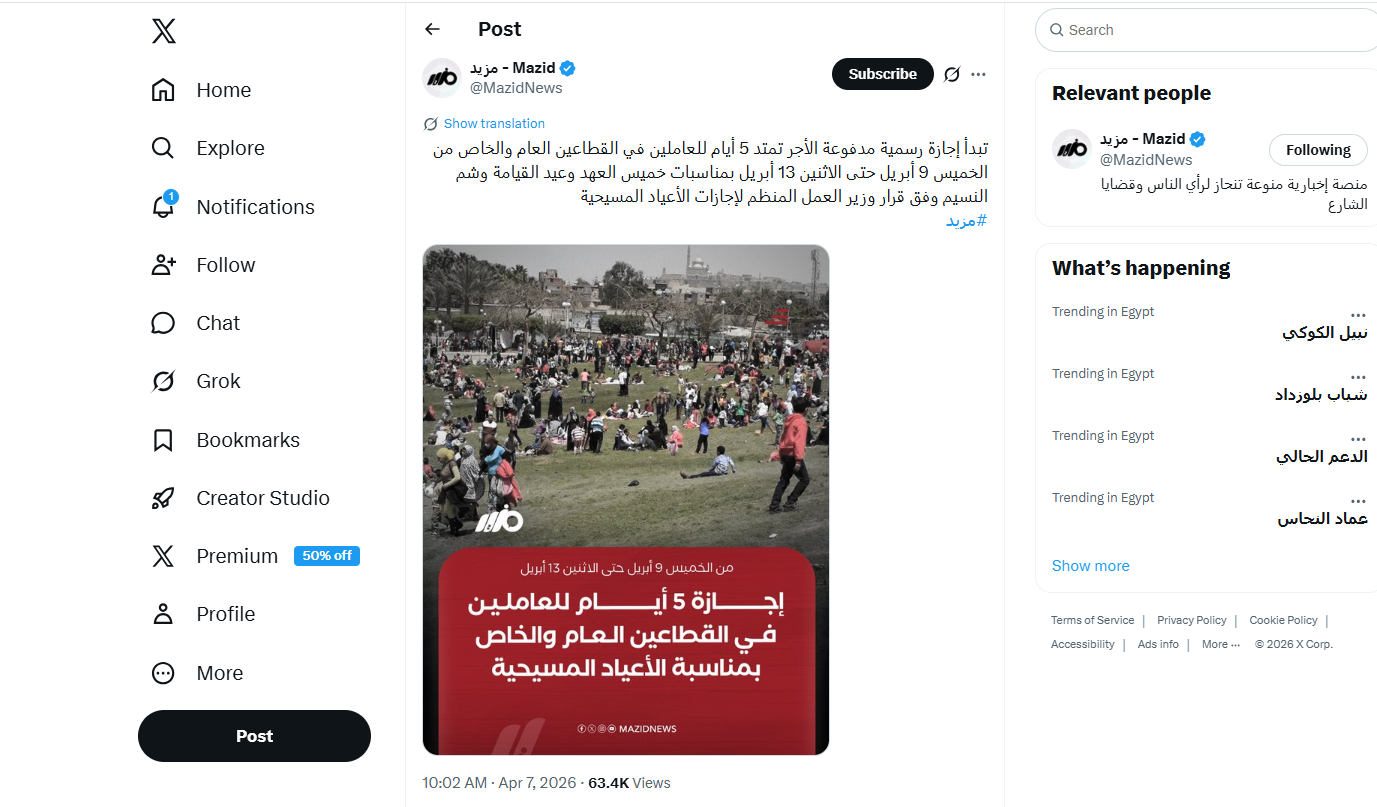 تتبع فريق "تفنيد" الخبر المتداول على موقع "مزيد" بخصوص إعلان 5 أيام إجازة للعاملين بالقطاع العام والخاص، يوم 7 أبريل 2026، ووجد أنه "غير دقيق"، وفقًا لبيانات رئاسة مجلس الوزراء.