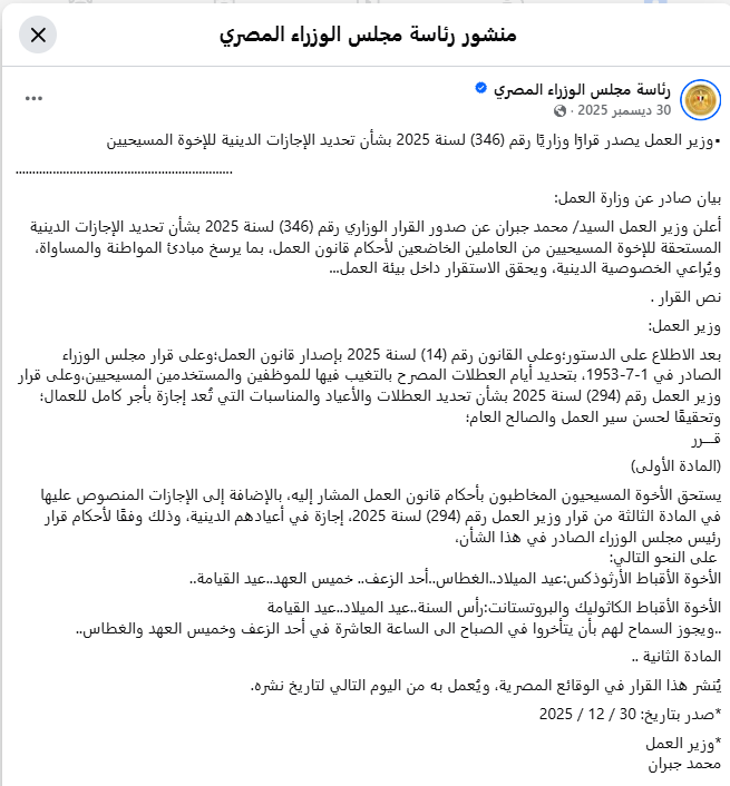 وبحسب القرار رقم 346 لسنة 2025 الصادر عن وزارة العمل المصرية، يحصل العاملون المسيحيون فقط في القطاع الخاص على أيام إجازات رسمية مدفوعة الأجر خلال مناسباتهم الدينية.