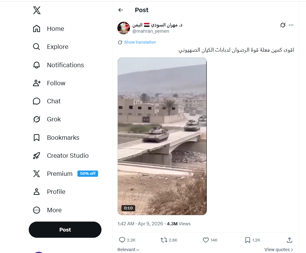 تتبع فريق "تفنيد" الفيديو المتداول على مواقع التواصل الاجتماعي فيسبوك وإكس، بخصوص استهداف قوة الرضوان التابعة لحزب الله لدبابات جيش الاحتلال الإسرائيلي في لبنان، يوم 9 أبريل 2026، ووجد أنه "مضلل" و"مفبرك"، وذلك من خلال التحليل التقني للفيديو.