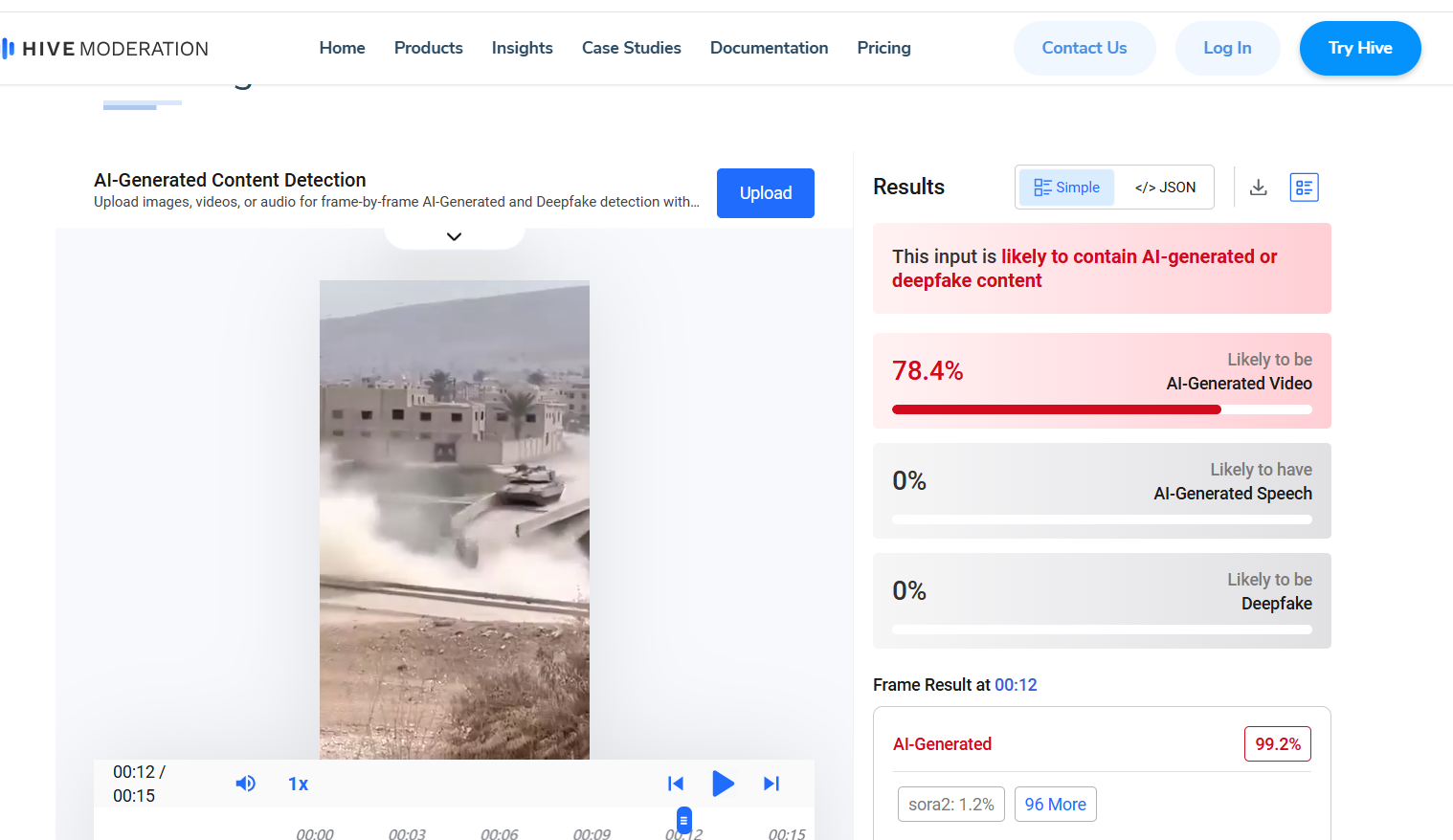 وتبين أن المقطع "مفبرك" وتم توليده بالذكاء الاصطناعي، وفقًا للأدلة التقنية والبصرية، ويظهر حركة الدبابة وانهيار الجسر أن الغبار الناتج يختفي بسرعة غير طبيعية، وهو ما تؤكده أدوات التحليل، ومنها موقع "HIVE MODERATION".