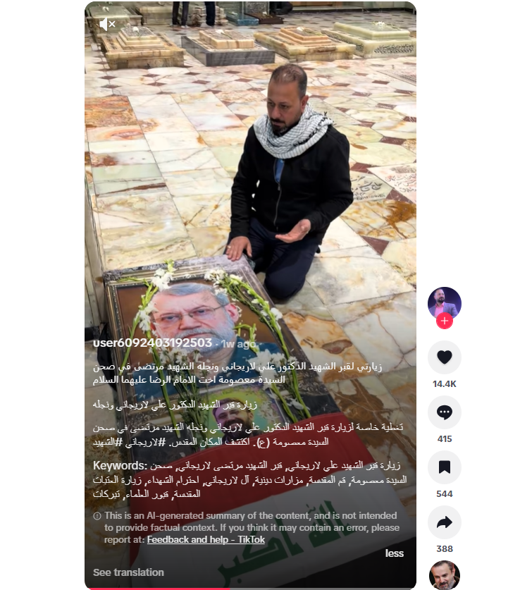 وبالبحث عن أصل الصورة، وجدنا مقطع فيديو بحساب تيك توك لشخص عراقي بالفعل باسم "الجراح"، وثق زيارته لقبر لاريجاني ويظهر العلم العراقي عليه.