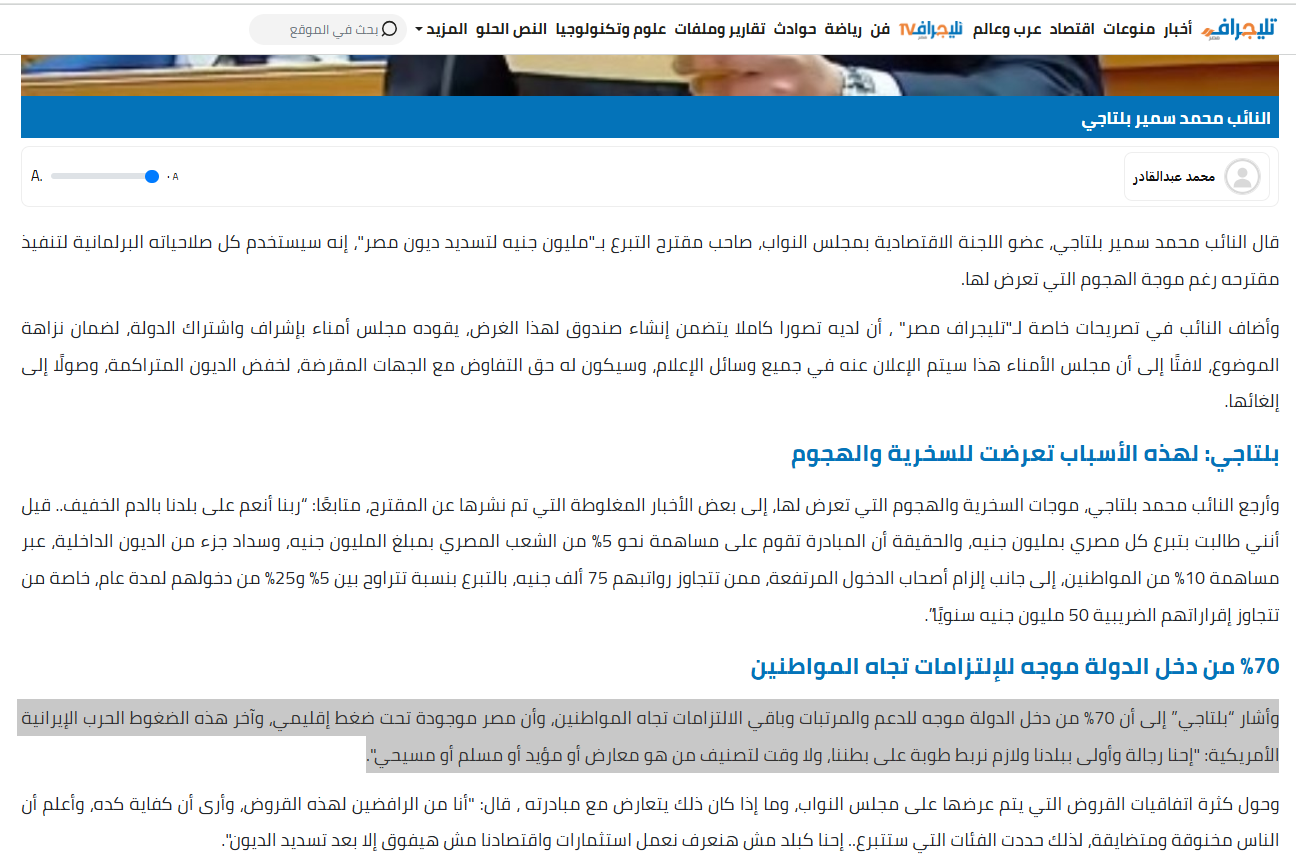 تتبع فريق "تفنيد" تصريحات عضو اللجنة الاقتصادية بمجلس النواب المصري، بخصوص دخل مصر الموجه للدعم والمرتبات وباقي الالتزامات تجاه المواطنين، في تصريحات خاصة لموقع "تليجراف"، يوم 9 أبريل 2026، ووجد أنه "مضلل"، وفقًا للموازنة العامة للدولة.