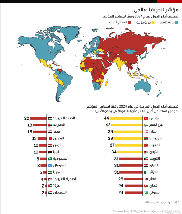 ووفقًا لمؤشر المنظمة الصادر في يوليو 2025، يصل مجموع النقاط التي حصلت عليها مصر بالمؤشر إلى 18 من 100، مشيرًا إلى إن "التعبير عن المعارضة قد يُعرّض صاحبه للملاحقة الجنائية والسجن"، وأن "الحريات المدنية، بما فيها حرية الصحافة وحرية التجمع، مقيدة بشدة".