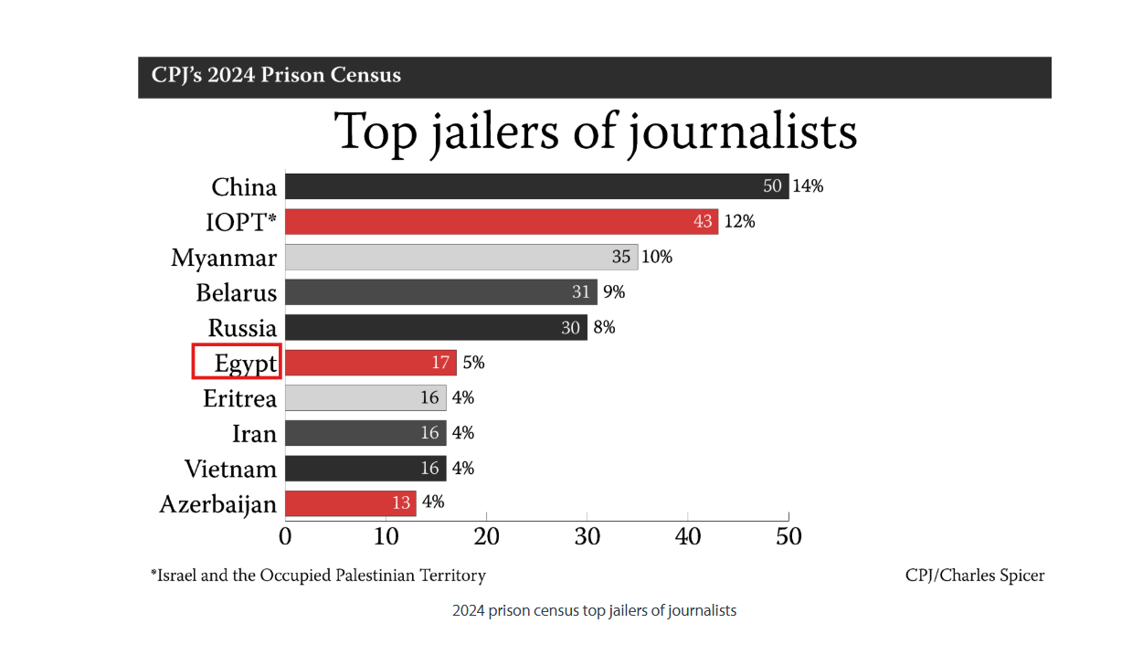 فيما احتلت مصر المرتبة السادسة عالميًا، في حبس الصحفيين لعام 2024، بحسب آخر تقرير للجنة حماية الصحفيين، وسبقها في الترتيب الصين وإسرائيل وميانمار وبيلاروسيا وروسيا.
