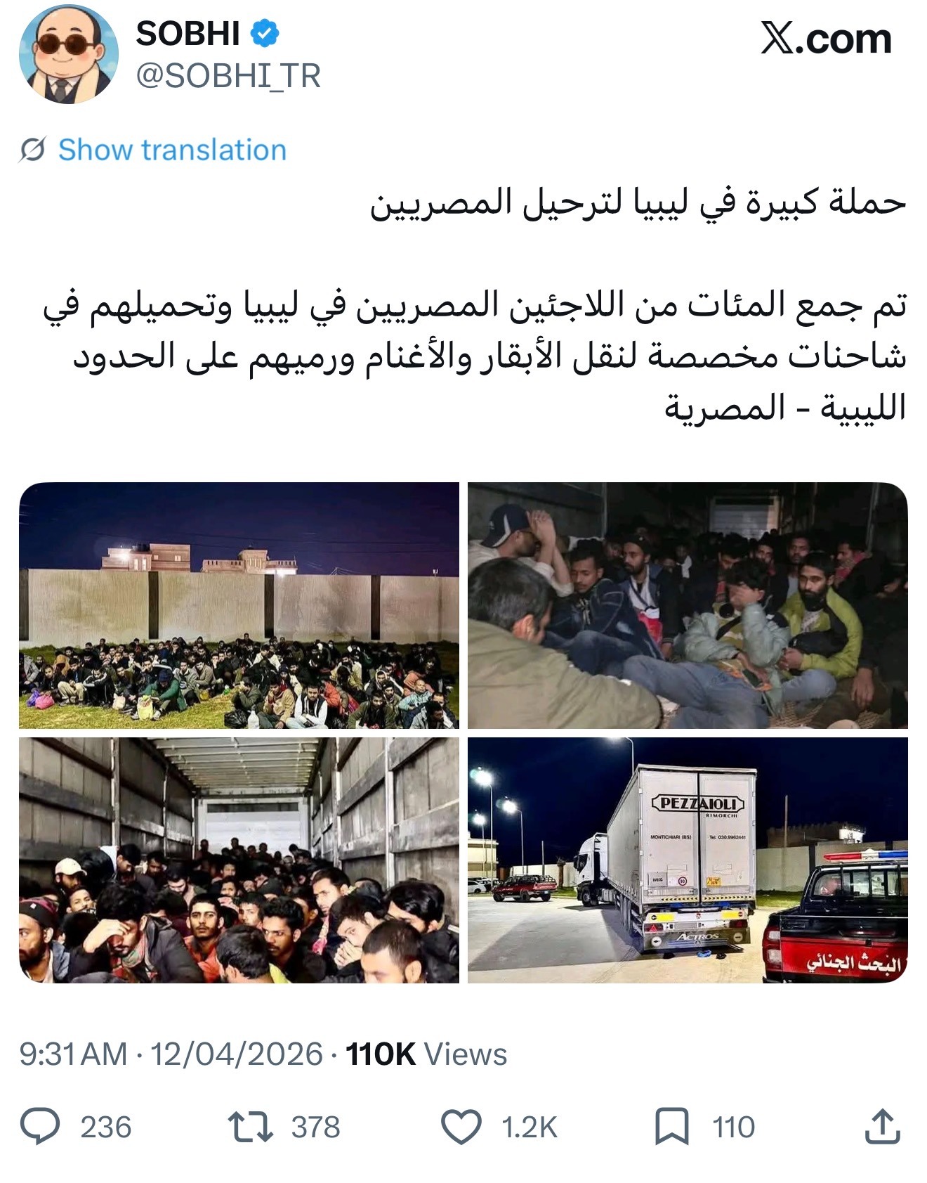 تتبع فريق "تفنيد" الادعاء المتداول على موقع إكس بتاريخ 12 أبريل 2026، بشأن ترحيل ليبيا مئات من اللاجئين المصريين في شاحنات للحيوانات، ورميهم على الحدود الليبية - المصرية، مع إرفاق صور لإثبات الادعاء، واتضح أنه "مضلل"، وفقًا لأخبار محلية ليبية وبيانات مؤسسة "العابرين".