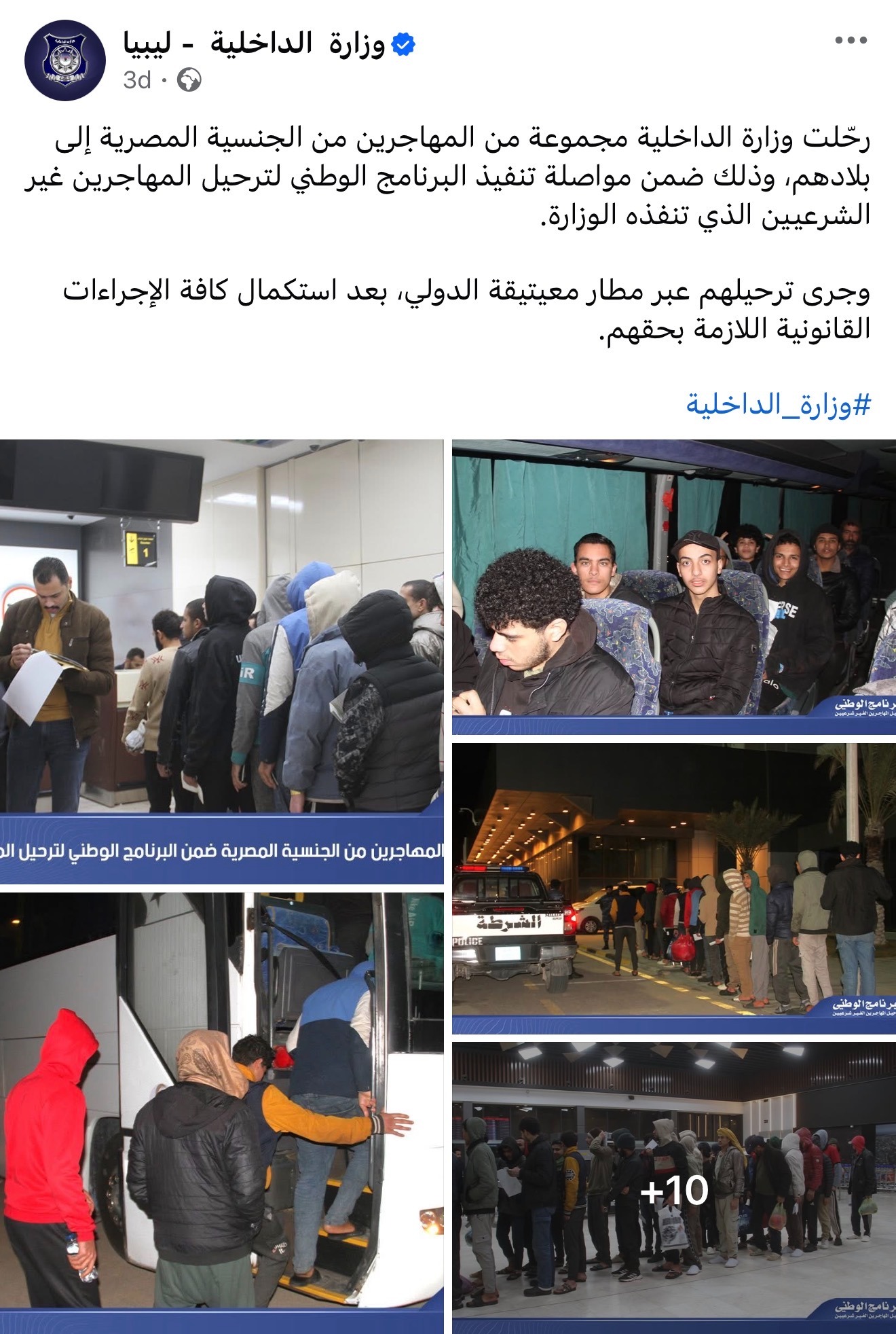 وتظهر الصور ترحيلهم عبر حافلات آدمية عادية، تمهيدا لترحيلهم عبر مطار معيتيقة الدولي، أي أن وصولهم إلى مصر تم جوًا، وتم ترحيل سوريين من ليبيا منذ أربعة أيام، ومغاربة في 2 أبريل 2026، وكلهم بالطريقة ذاتها وعبر المطار ذاته، وفقًا لبيانات وزارة الداخلية الليبية في الأيام المذكورة.