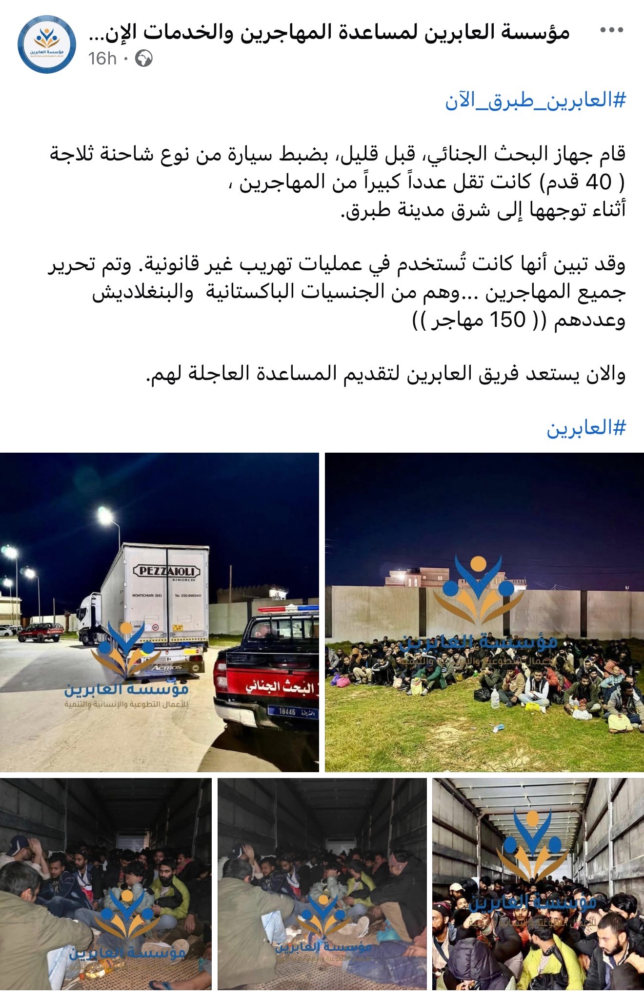 ووجدنا الصور على مواقع إخبارية ليبية مثل "فواصل" و"أخبار ليبيا" و"بوابة ليبيا الإخبارية"، لضبط جهاز البحث الجنائي شاحنة ثلاجة كانت تقل 150 مهاجرًا من جنسيات مختلفة أثناء توجهها إلى شرق مدينة طبرق.