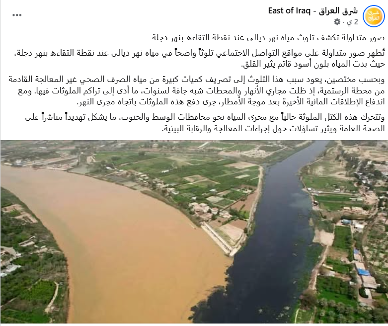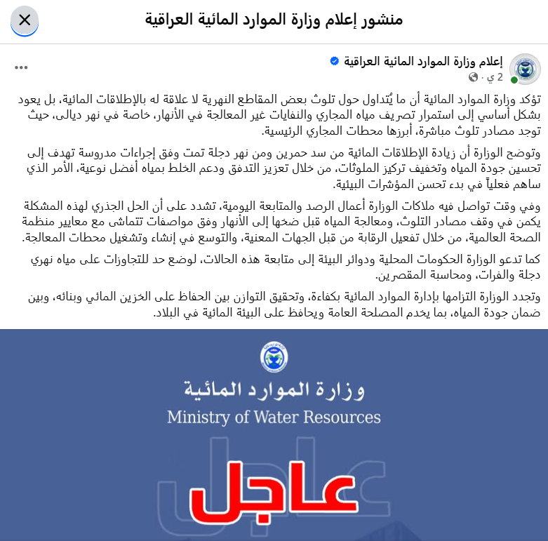 هذا المحتوى الذي قدمته قناة "العراقية"، يتطابق مع بيان نشرته وزارة الموارد المائية في 9 أبريل، بخصوص حالة التلوث التي شهدها نهر ديالى ونهر دجلة منذ مطلع شهر أبريل، حيث أكدت الوزارة أن ما يُتداول حول تلوث بعض المقاطع النهرية لا علاقة له بالإطلاقات المائية من سد حمرين، بل يعود بشكل أساسي إلى استمرار تصريف مياه المجاري والنفايات غير المعالجة في الأنهار، خاصة في نهر ديالى، حيث توجد مصادر تلوث مباشرة، أبرزها محطات المجاري الرئيسية، مؤكدة أن زيادة الإطلاقات المائية من سد حمرين ونهر دجلة تمت وفق إجراءات مدروسة تهدف إلى تحسين جودة المياه وتخفيف تركيز الملوثات.