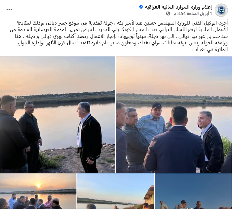 وفي ذات اليوم، أعلنت الوزارة أيضا عن زيارة ومتابعة أعمال "فتح" مقطع نهر ديالى أسفل "الجسر الكونكريتي ورفع اللسان الترابي" لاستقبال الإطلاقات المائية القادمة إلى بغداد وتقليل خطر الفيضانات، وتمرير الموجة الفيضانية التي تم إطلاقها من بحيرة حمرين.