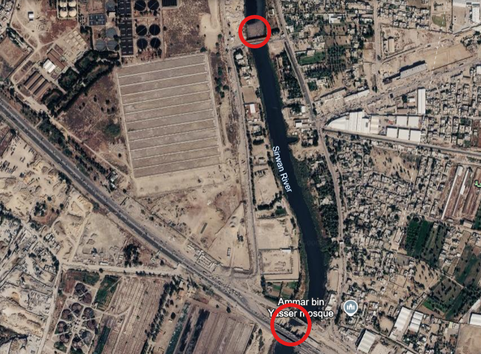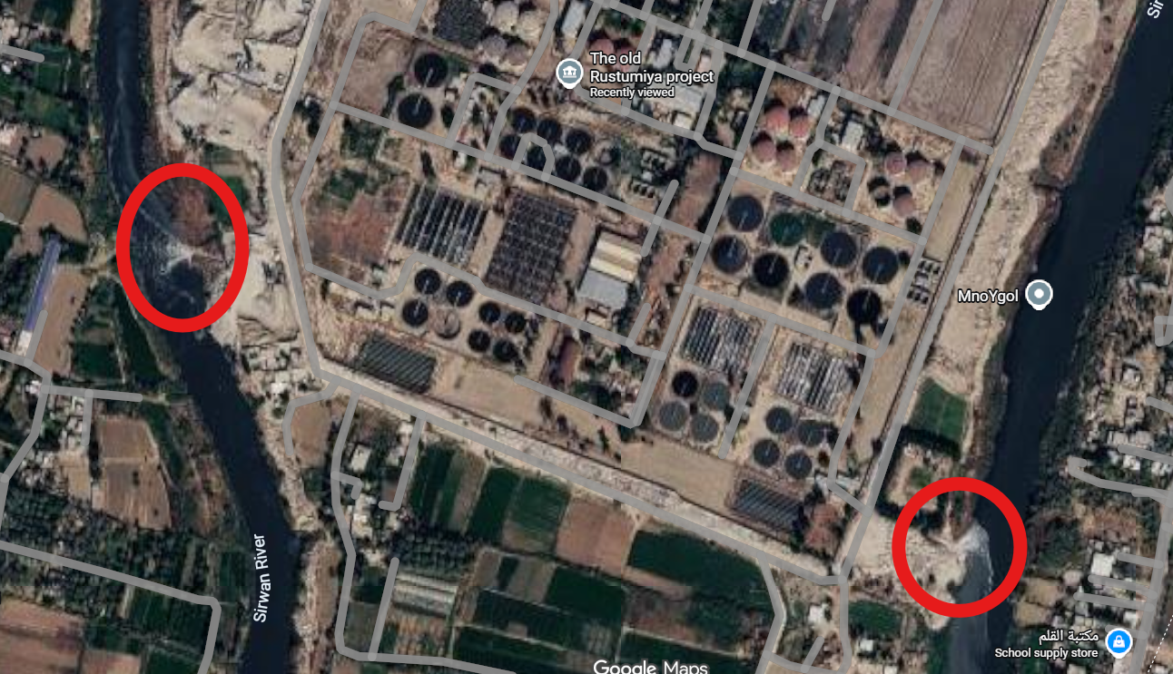 بمتابعة المواقع التي تحدثت عنها وزارة الموارد المائية عبر جوجل إيرث، يتضح وجود سدة ترابية تضيّق مجرى نهر ديالى بشكل كبير جدا تحت جسر ديالى عند محطة الرستمية للصرف الصحي في الإحداثي 33°16'39.25"N 44°32'22.56"E، كما توجد سدة ترابية أخرى شمالها على بعد كيلومتر واحد تحت الجسر الحديدي عند الإحداثي 33°17'12.52"N 44°32'17.56"E، تغلق نهر ديالى بالكامل وتعزل المقطع الشمالي عن الجنوبي الذاهب نحو محطة الرستمية للصرف الصحي والذي يتوجه لاحقا نحو نهر دجلة.