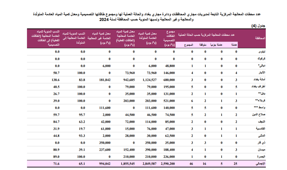 ويشير الجهاز المركزي للإحصاء إلى أن نسبة معالجة مياه المجاري في العراق في 2024 تبلغ 67% فقط، ما يعني أن 33% من مياه الصرف الصحي ترمى إلى الأنهار دون معالجة، وأن أكثر من مليون متر مكعب يوميا من مياه المجاري غير المعالجة يتم تفريغها في الأنهار من بينها 200 ألف متر مكعب يوميا في بغداد وحدها تذهب لنهري ديالى ودجلة، كما توجد 46 محطة معالجة مركزية في العراق لكن العاملة منها أو العاملة جزئيا هي 30 محطة فقط.