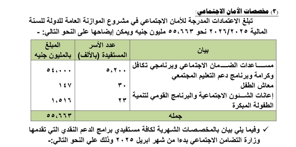 أيضا الدعم الخاص بتكافل وكرامة ذكر المدعي أنه بلغ 55.3 مليار جنيهًا في موازنة 2026 - 2027، مقارنة بـ41 مليار جنيهًا في العام الماضي، بينما فعليًا سجل في العام الماضي 54 مليار جنيهًا وليس 41 مليار جنيهًا.
