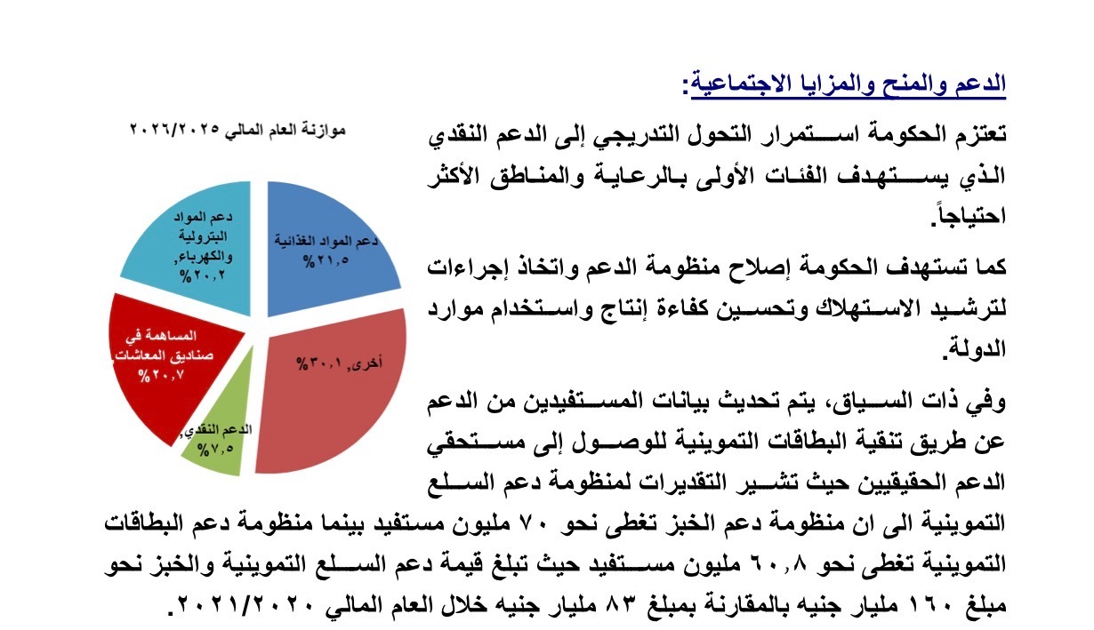 وأظهرت موازنة الدولة للعام المالي 2025 - 2026، أن عدد المستفيدين من منظومة دعم البطاقات التموينية بلغ نحو 60.8 مليون مستفيدًا ولم يصل إلى 75 مليونًا كما ذكر المدعي، بينما بلغ عدد المستفيدين من منظومة دعم الخبز 70 مليون مستفيدًا.