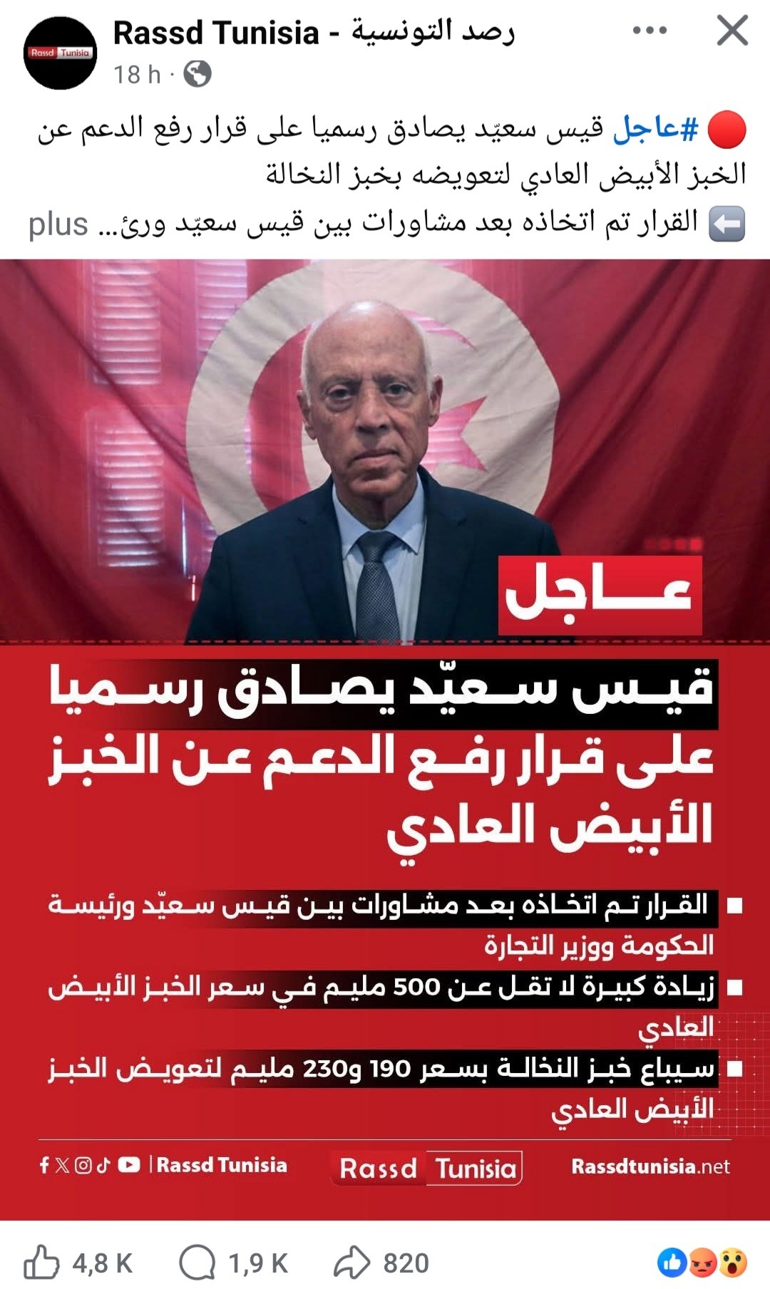 تتبع فريق “تفنيد” الادعاء الذي تداولته منصة "رصد التونسية" على فيسبوك، بتاريخ 13 أبريل 2026، والذي تناقلته بعد ذلك صفحات على وسائل التواصل الاجتماعي، حول رفع الدعم عن الخبز الأبيض وزيادة سعره، واتضح أنه “مضلل”، وذلك بالعودة إلى الرائد الرسمي، والاتصال بمنظمة "الدفاع عن المستهلك".