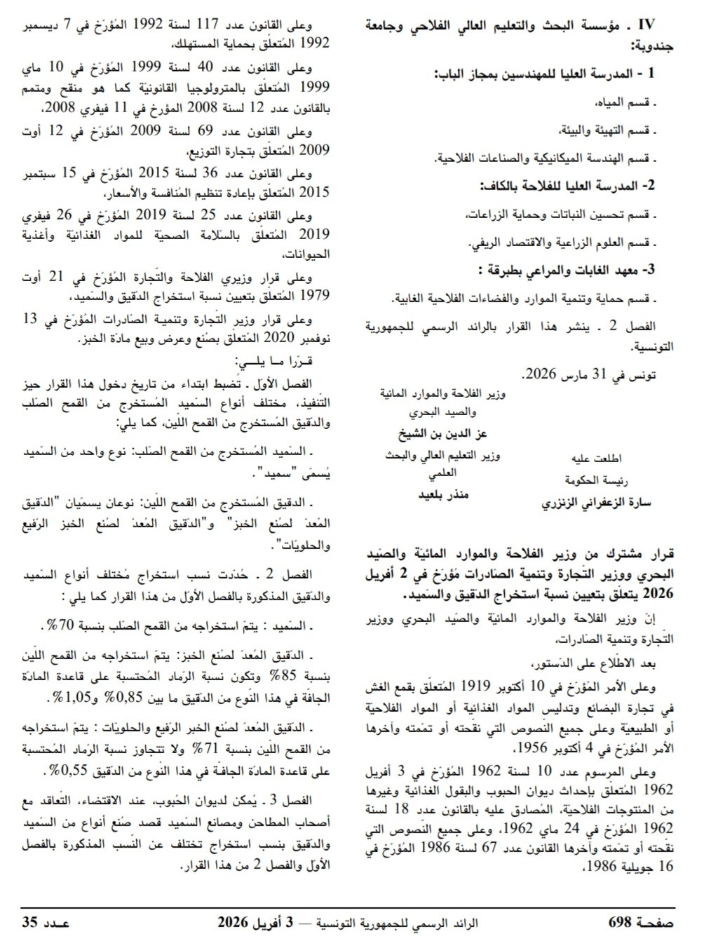 بحثنا أولا في الرائد الرسمي للجمهورية التونسية، ولم نجد أثر لهذا الخبر، لكن صدر يوم 2 أبريل 2026 قرارًا مشتركًا عدد 35، من وزيرَيْ الفلاحة والموارد المائية والصيد البحري والتجارة وتنمية الصادرات، يتعلّق بتعيين نسبة استخراج الدقيق والسميد من القمح.