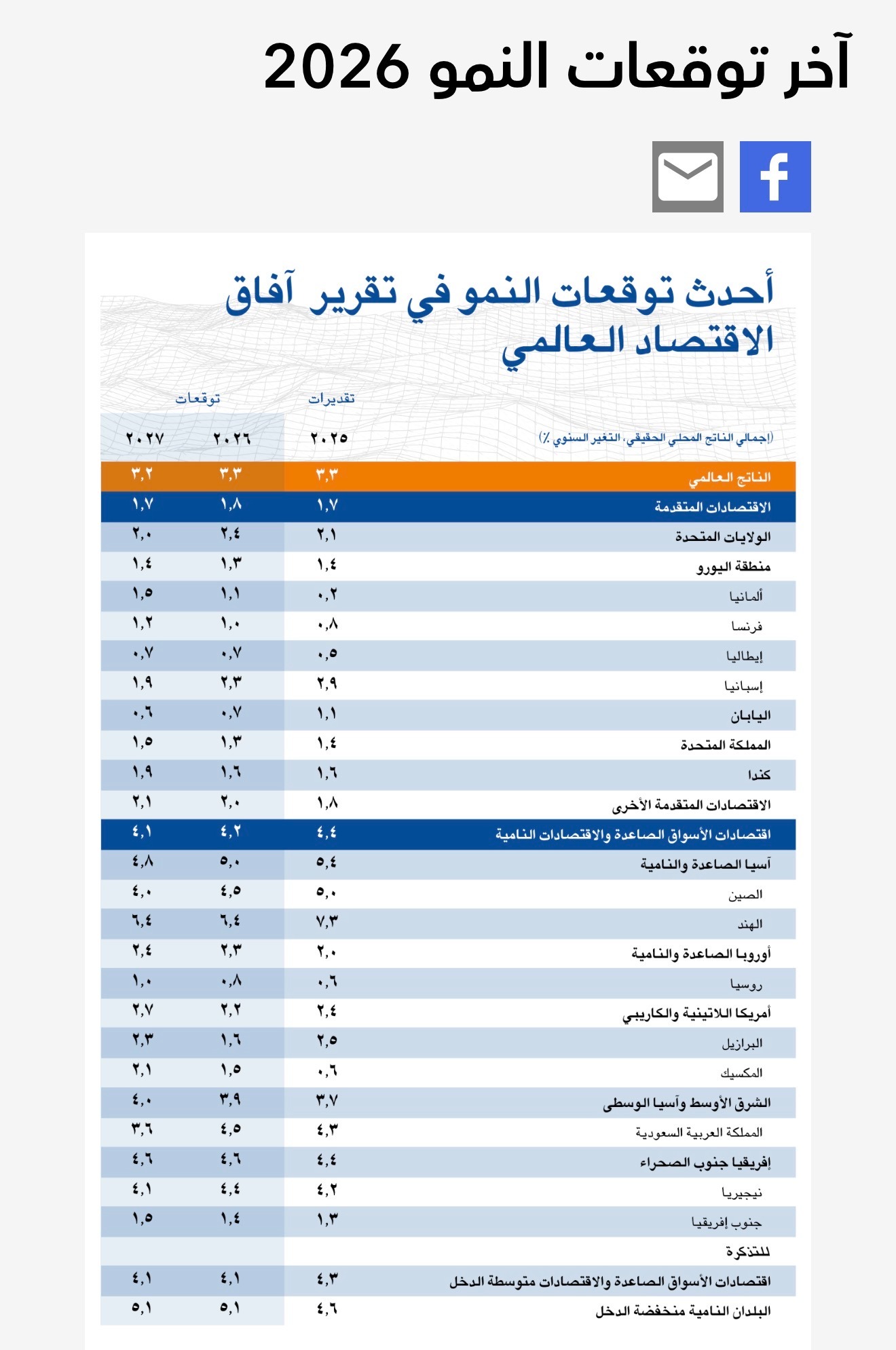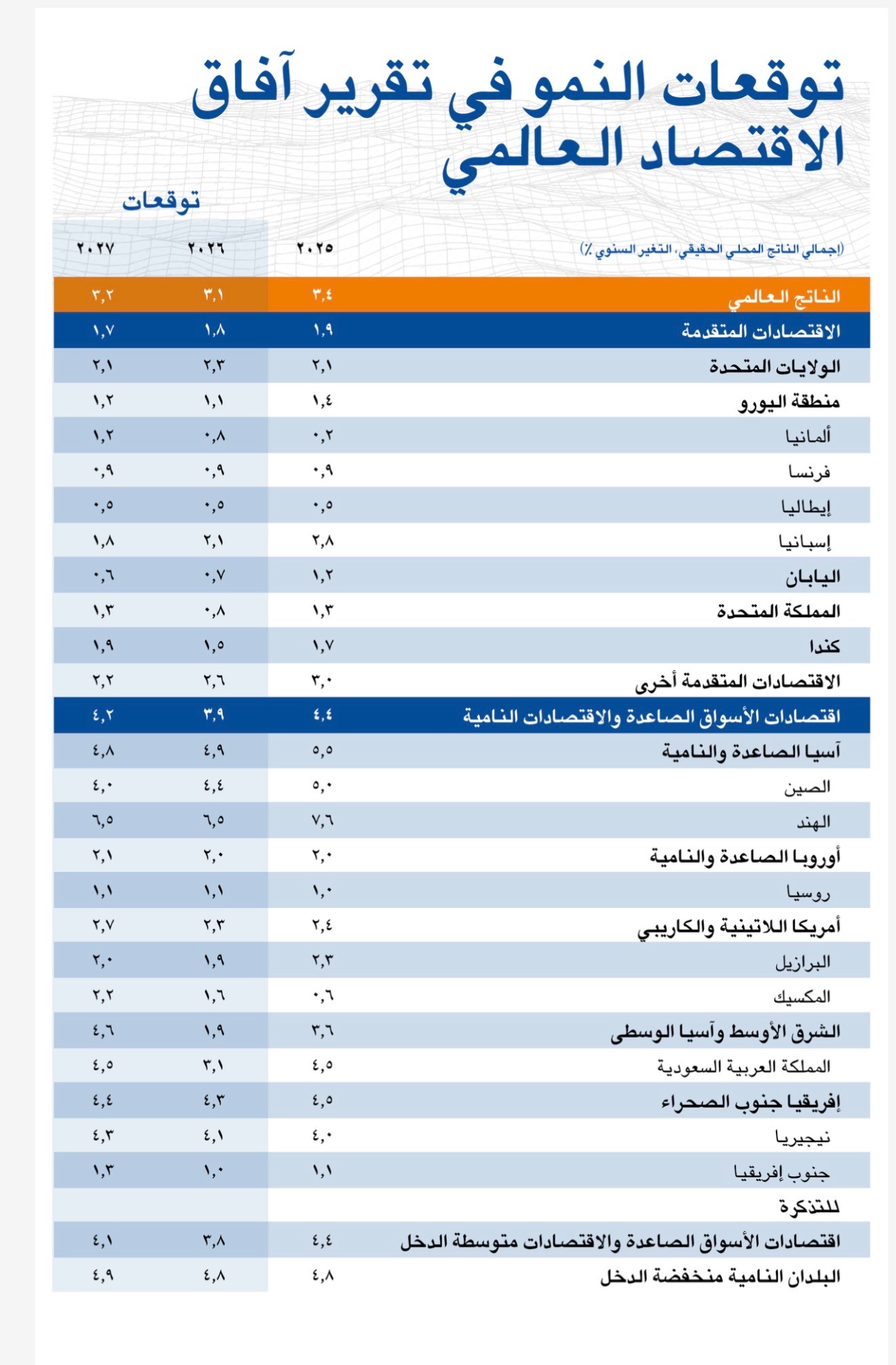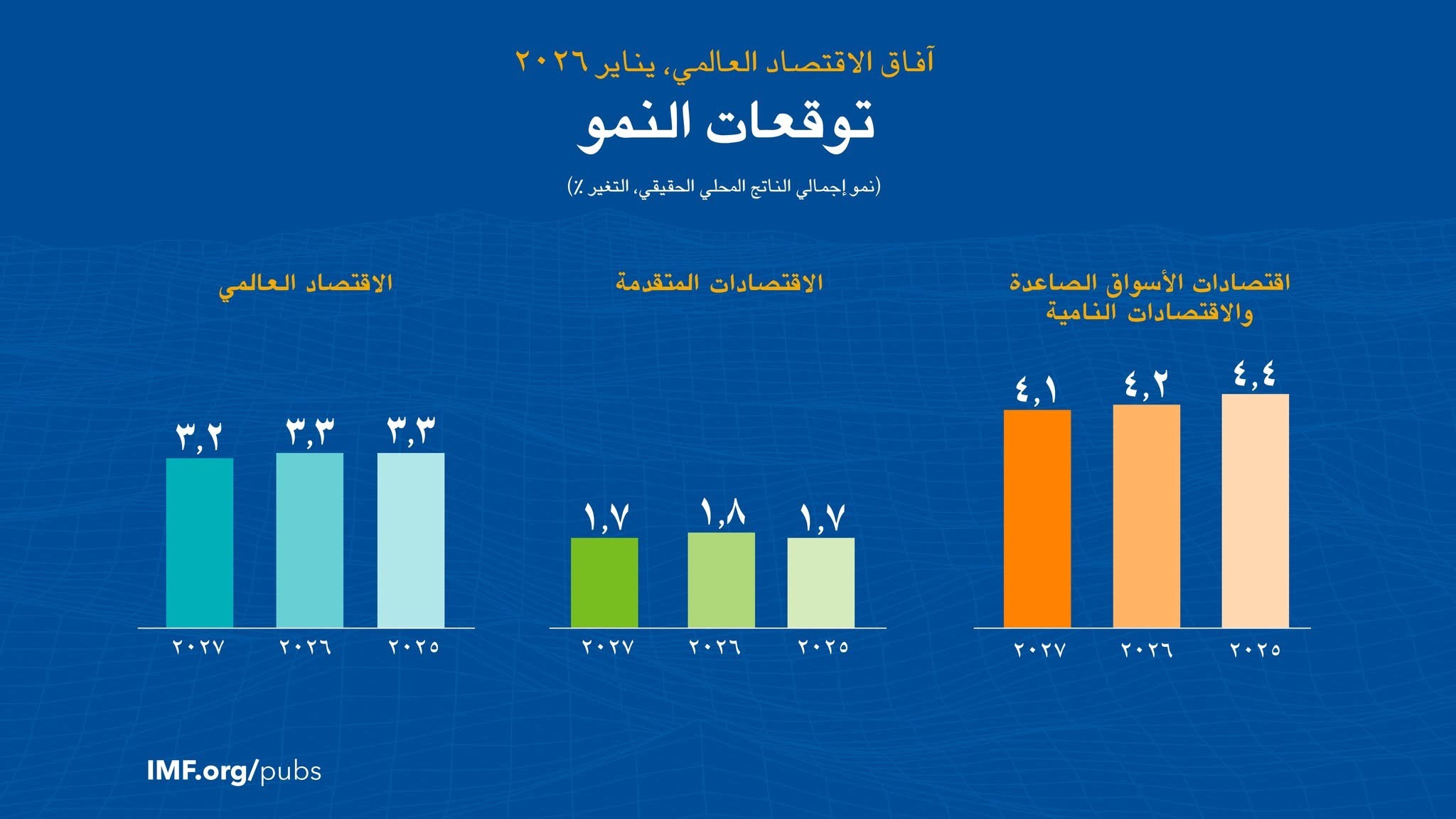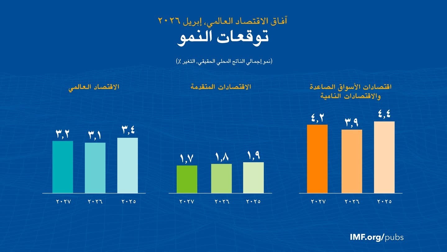 وأوضح تقرير أبريل 2026، أن النشاط الاقتصادي أصبح يواجه الآن اختبارا حقيقيا جراء اندلاع الحرب في الشرق الأوسط. وبافتراض أن يظل الصراع محدود المدة والنطاق، يُتوقع تباطؤ النمو العالمي إلى 3,1% في 2026، و3,2% في 2027، ويُتَوَقّع أن يتجلى تباطؤ النمو وارتفاع التضخم بصفة خاصة في اقتصادات الأسواق الصاعدة والاقتصادات النامية.