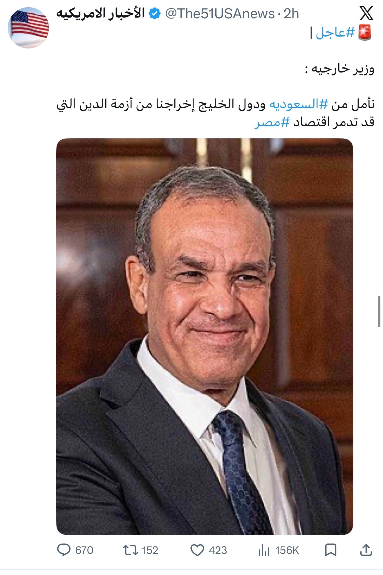 تتبع فريق "تفنيد" الادعاء المتداول على موقع التواصل الاجتماعي إكس، بتاريخ 15 أبريل 2026، بشأن طلب وزير الخارجية المصري من السعودية ودول الخليج مساعدة مصر لإخراجها من أزمة الديون، واتضح أنه "مضلل"، وفقًا للبحث العكسي ووزارة الخارجية المصرية.