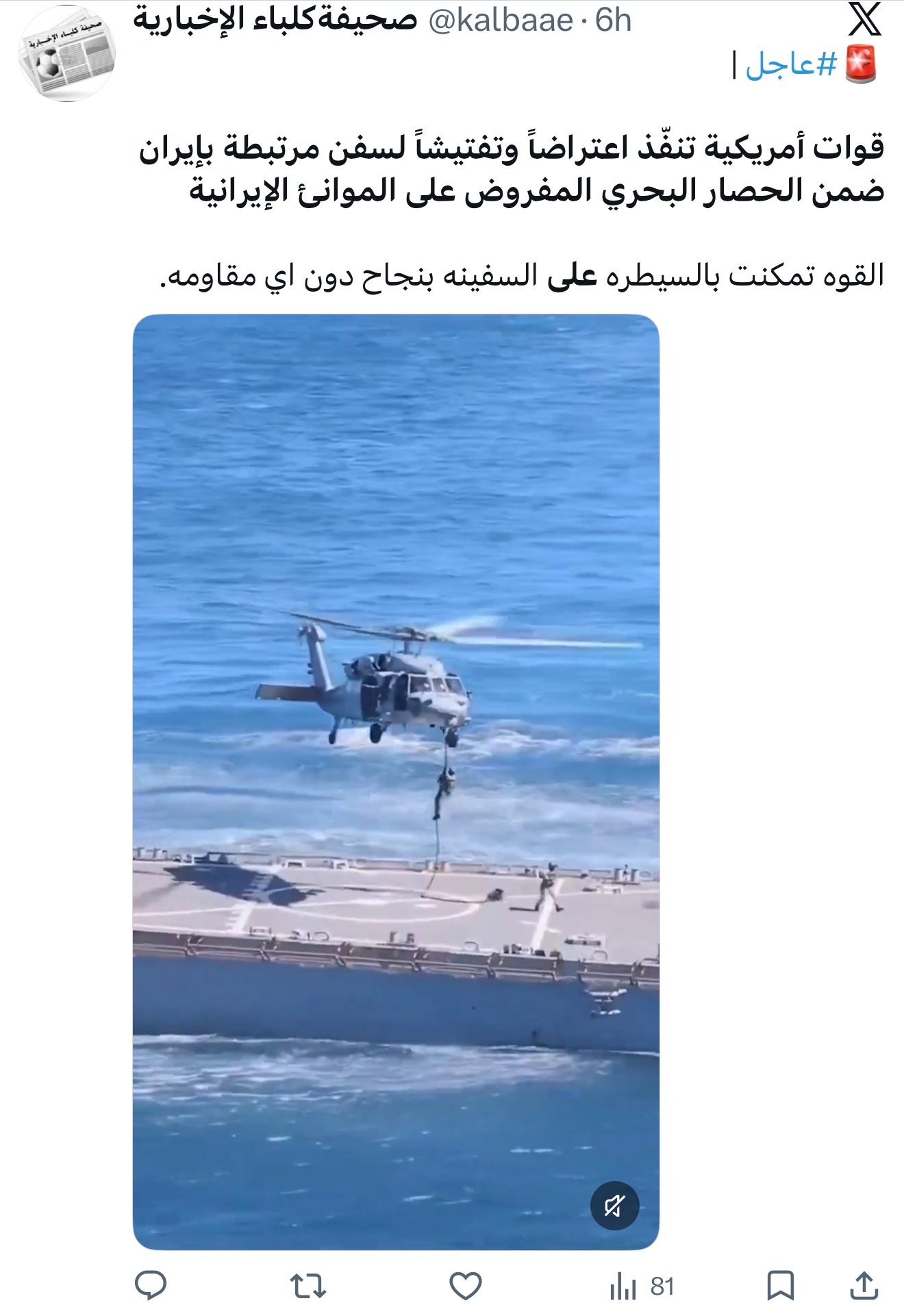 تتبع فريق "تفنيد" الادعاء المتداول على مواقع إخبارية وبين مستخدمي موقع إكس، بتاريخ 17 أبريل 2026، بشأن تنفيذ القوات الأمريكية اعتراضاً وتفتيشاً لسفن مرتبطة بإيران ضمن الحصار البحري المفروض على الموانئ الإيرانية، واتضح أنه "مضلل" وفقًا للبحث العكسي عن الفيديو.