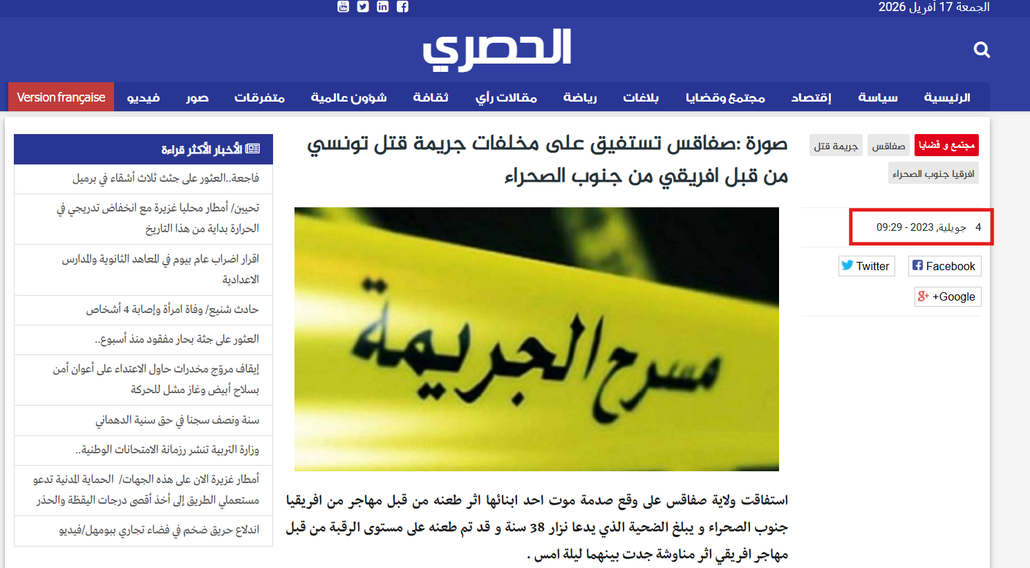 كما تبين أنه سبق أن تداولت منصات إعلامية الخبر، فقد نشر موقع "الحصري" الخبر، بتاريخ 4 يوليو 2023، بعنوان "صفاقس تستفيق على مخلفات جريمة قتل تونسي من قبل إفريقي من جنوب الصحراء". وبالتالي فإن فيديو الادعاء "قديم" وليس مثل ما يتم الترويج له.