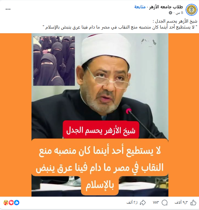 شيخ الأزهر يحسم الجدل: لا يستطيع أحد أينما كان منصبه منع النقاب في مصر، ما دام فينا عرق ينبض بالإسلام.
