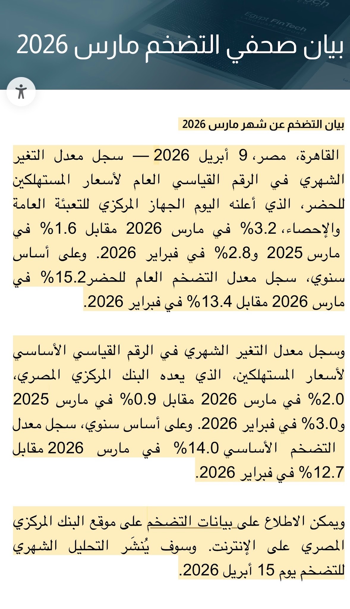 وفي 9 أبريل 2026 أعلن الجهاز المركزي للتعبئة العامة والإحصاء في بيانه عن التضخم، أن معدل التضخم (العام) السنوي لإجمالي الجمهورية قد ارتفع ليسجل 13.5% لشهر مارس 2026، مقابل 11.5% لشهر فبراير 2026.