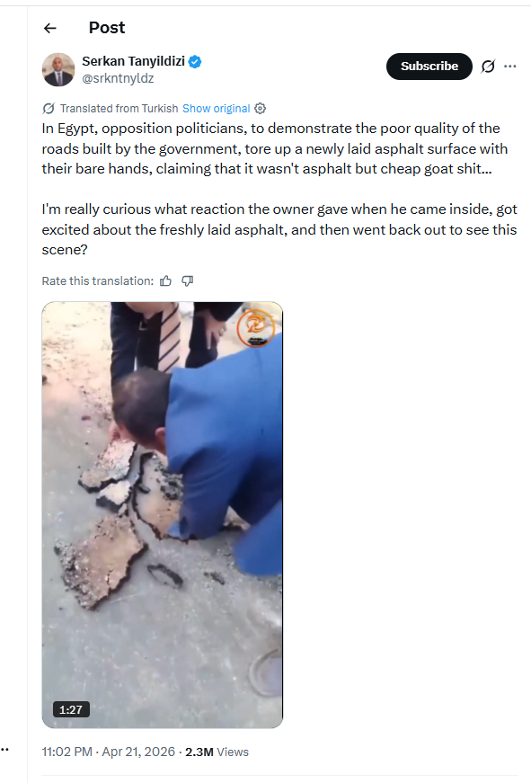 فيديو لشخص ينزع الأسفلت باليد، بعنوان: "شوارع مصر بروث الحيوانات".