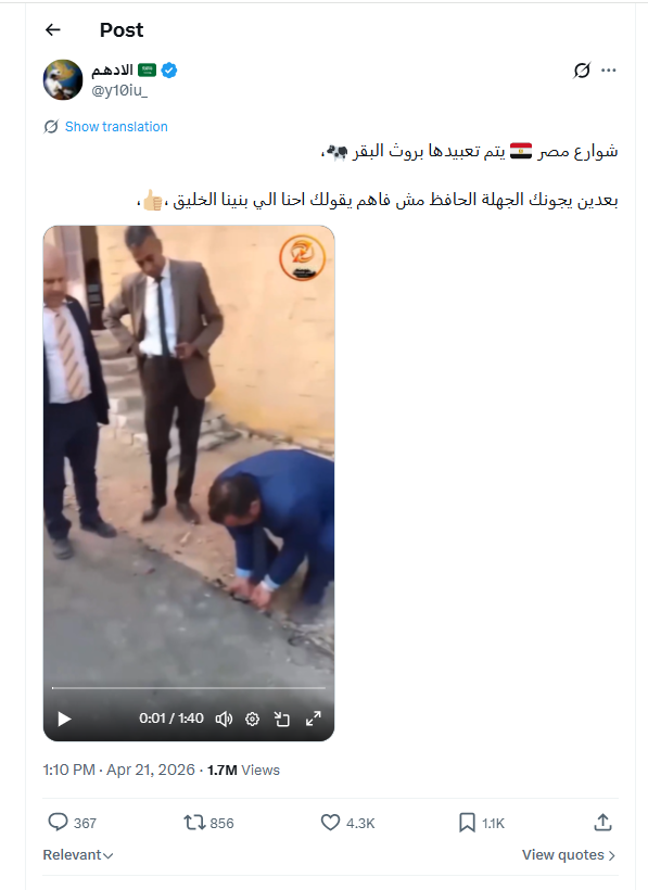 تتبع فريق "تفنيد" الفيديو المتداول على حسابات سعودية بموقعي التواصل الاجتماعي فيسبوك وإكس، بخصوص رصف شوارع مصر بروث الحيوانات، يوم 21 أبريل 2026، ووجد أنه "مضلل"، و"قديم" وفقًا للبحث العكسي.