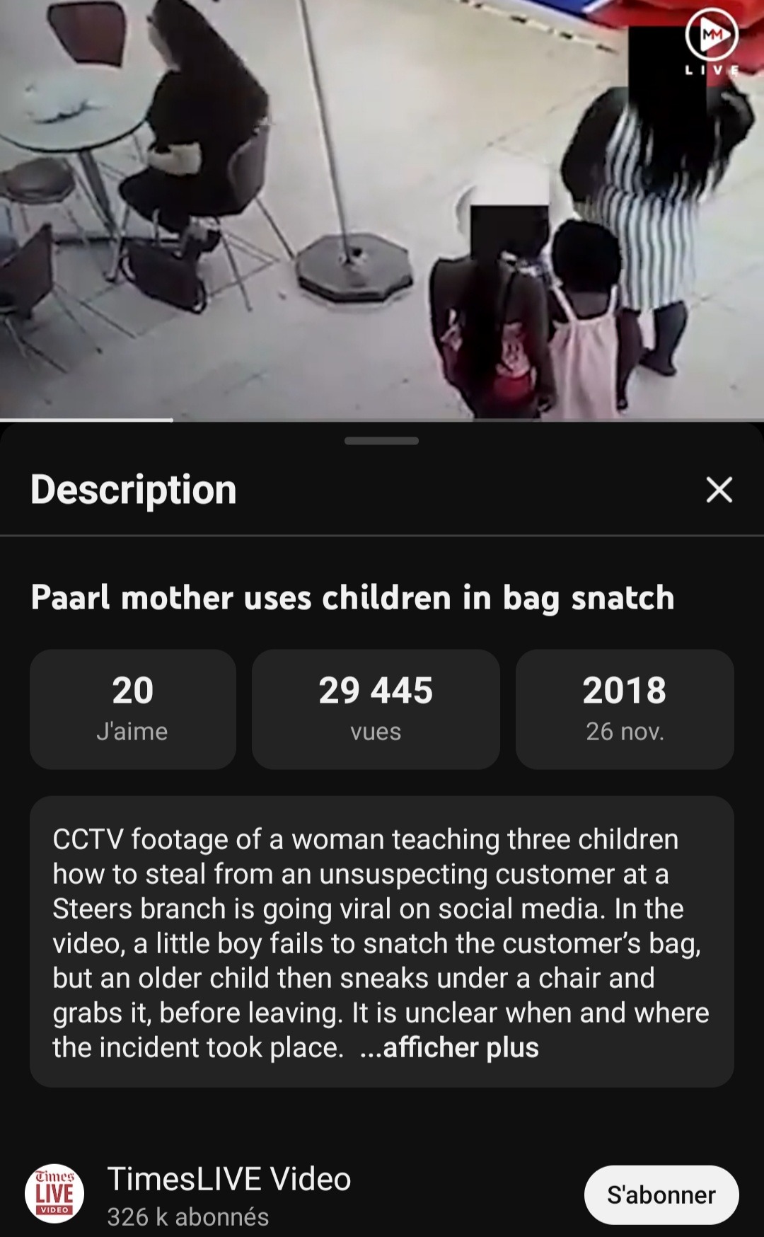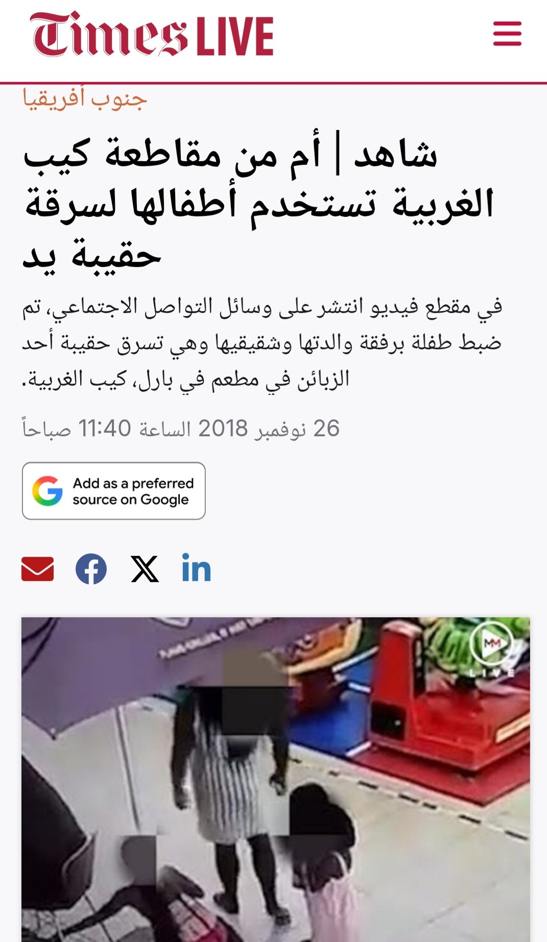 ونشرت صحيفة times live الخبر والفيديو يوم 26 نوفمبر 2018، بعنوان "جنوب أفريقيا، شاهد أم من مقاطعة كيب الغربية تستخدم أطفالها لسرقة حقيبة يد".