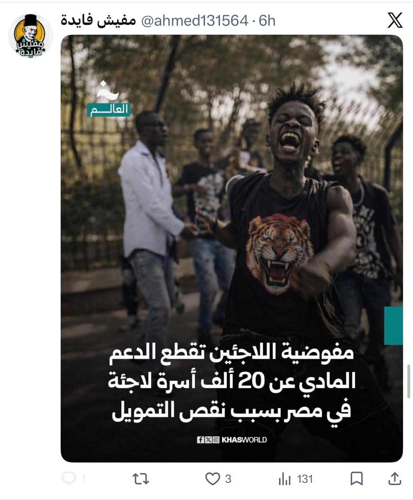 مفوضية اللاجئين تقطع الدعم المادي عن 20 ألف أسرة لاجئة في مصر، بسبب نقص التمويل.