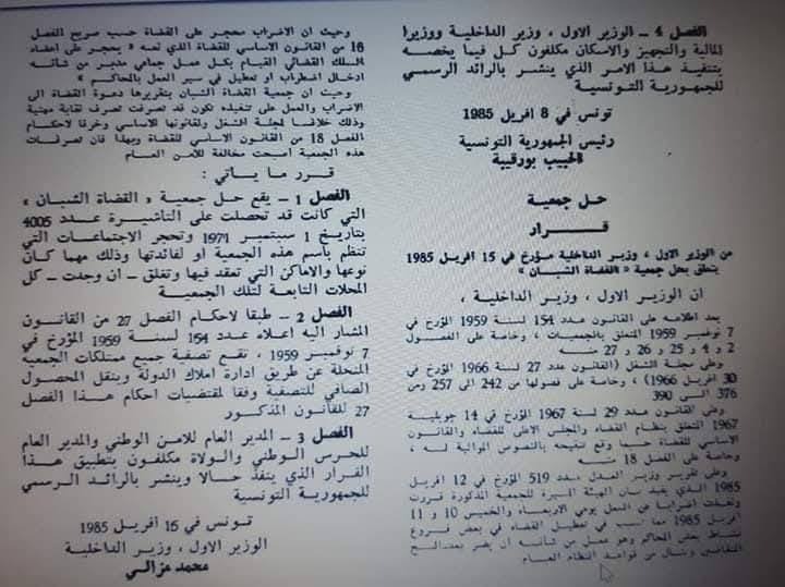 في 11 أبريل 1985 نفذ القضاة إضرابا عن العمل بدعوة من جمعية القضاة الشبان، للمطالبة باستقلال القضاء، وجاء بعد الإضراب قرار في 15 أبريل بحل الجمعية، وورد بالقرار الذي وقعه الوزير الأول ووزير الداخلية في ذلك الوقت محمد مزالي، أن الجمعية تسببت في تعطيل القضاء في بعض فروع المحاكم، ما يضر بمصالح المتقاضين وينال من قواعد النظام العام، وحيث إن الإضراب ممنوع على القضاة حسب الفصل 18 من القانون الأساسي للقضاة، لذلك يقع حل "جمعية القضاة الشبان".