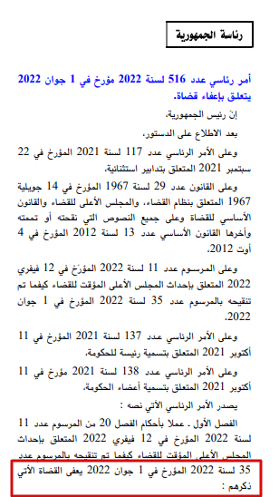 صدر بالرائد الرسمي أمر رئاسي عدد 516 لسنة 2022، مؤرخ في 1 يونيو 2022، بإعفاء 57 قاضيا. وذلك بعد اتهامهم بالفساد والتستر على متهمين في قضايا إرهاب. وكان سعيد حل في وقت سابق من سنة 2022، المجلس الأعلى للقضاء وعوضه بمجلس مؤقت.