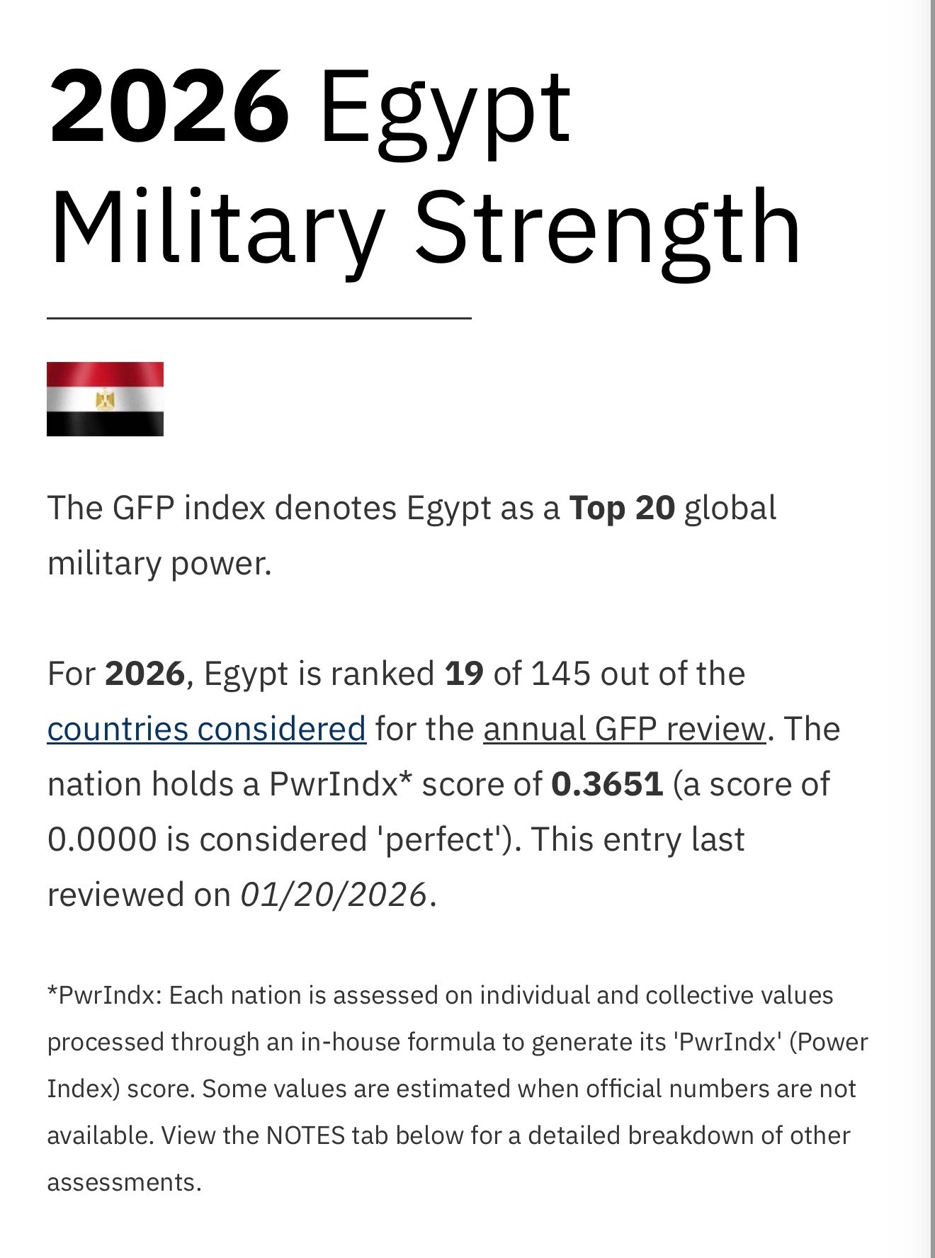 وأظهرت بيانات موقع جلوبال فاير باور لعام 2026 وهو المصدر الذي استشهد به المدعي، أن الجيش المصري جاء في المرتبة 19 عالميًا في قائمة القوة العسكرية وليس الـ12 عالميا.