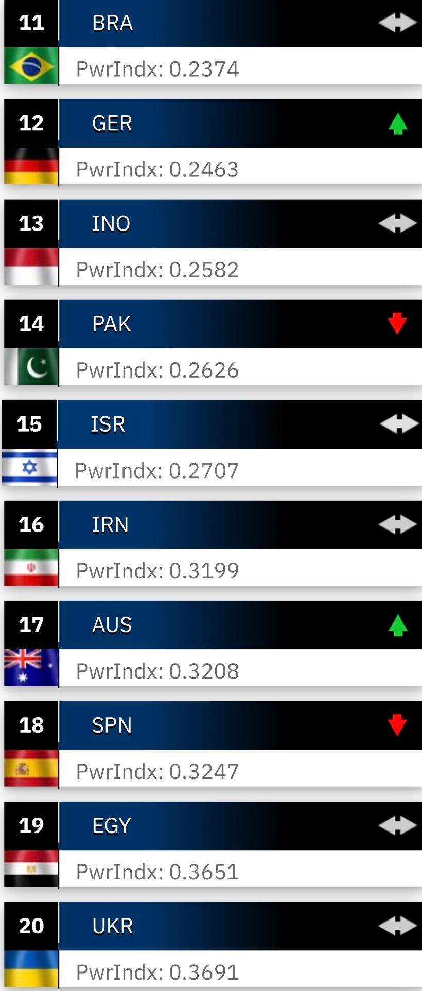 كما لم يأتي الجيش التركي والإسرائيلي بعده، حيث جاء التركي في المرتبة التاسعة، والإسرائيلي في الـ15.