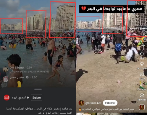 حيث بث موقع "المصري اليوم" سنة 2024، فيديو مباشر من الشاطئ بعنوان "مفيش مكان في البحر.. شواطئ الإسكندرية كاملة العدد بسبب رحلات اليوم الواحد"، واتضح أن المكان يتطابق تماما مع فيديو المهاجرين الأفارقة.