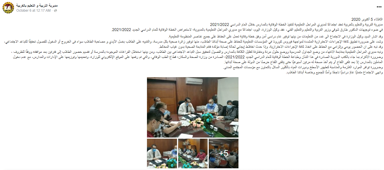 إذ نشرت الصفحة الرسمية لوزارة التربية والتعليم، بياًنا حول اجتماع عقدته وزارة التربية والتعليم يوم الثلاثاء 5 أكتوبر 2021، مع مديري المديريات التعليمية بالمحافظات؛ لاستعراض الخطة الوقائية للعام الدراسي الجديد 2021/2022.