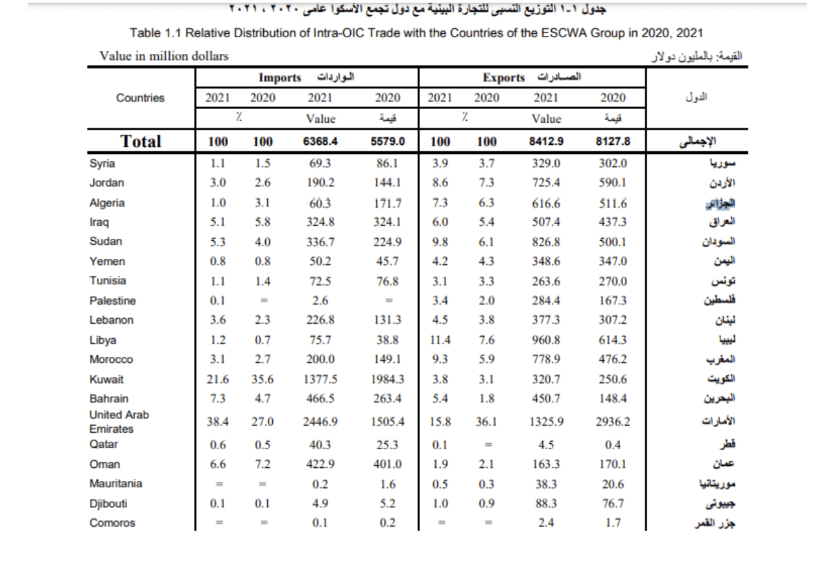 ووفقًا للتوزيع النسبي للتجارة البينية مع دول تجمع الأسكوا لعامي 2020 و2021، المدرج في النشرة السنوية للتجارة البينية، جاءت تفاصيل التبادل التجاري بين البلدين في عام 2021، عبارة عن 616.6 مليون دولارًا صادرات مصرية للجزائر، و60.3 مليون دولارًا واردات مصرية من الجزائر.