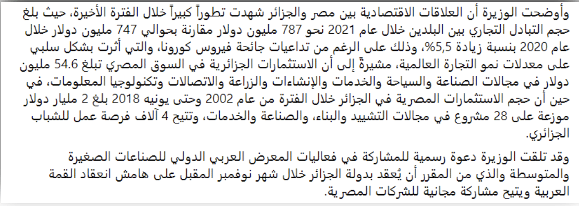 بالرجوع لأرقام الإحصاء اكتشفنا أن تصريح وزيرة التجارة "مضللًا" إذ لم تتطور العلاقات الاقتصادية المصرية الجزائرية بل انخفضت.. حيث بلغ حجم التبادل التجاري بينهما 676.9 مليون دولارًا في 2021 بعد أن كان 683.3 مليونًا في 2020