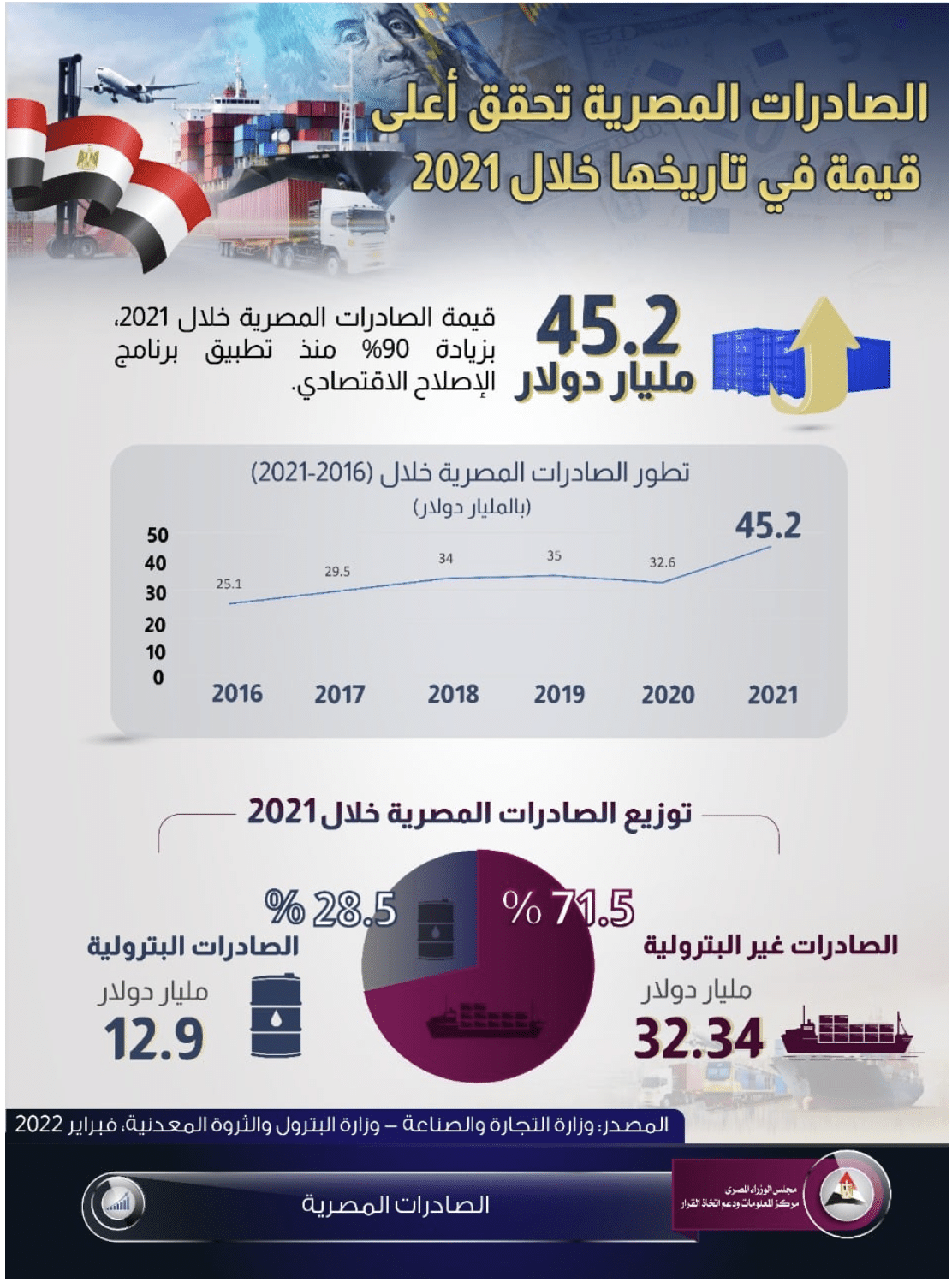 كما أن صفحة رئاسة مجلس الوزراء المصري نشرت بيانًا في ذات اليوم، قال فيه رئيس مجلس الوزراء، إن إجمالي الصـادرات المصرية بلغت 45.2 مليار دولارًا في عام 2021، وهو أعلى رقم حققته الصـادرات المصرية في تاريخها.