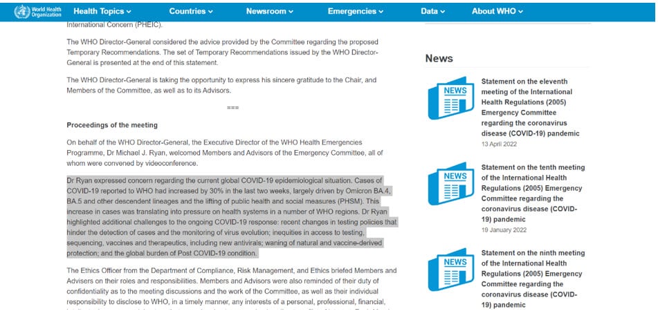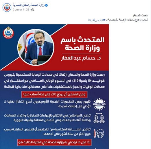 وكانت وزارة الصحة والسكان المصرية في يوم 3 يوليو 2022، كشفت عبر صفحتها الرسمية على موقع التواصل الاجتماعي "فيسبوك" من خِلال انفوجراف بتصريحات لمتحدث وزارة الصحة، عن رصد ارتفاع في معدلات الإصابة المجتمعية بفيروس كورونا بنسبة 6.9% في الأسبوع الوبائي الماضي مع استقرار في معدلات الوفيات والحجز بالمستشفيات عند أدنى مُعدلاتها منذ بداية الجائحة.