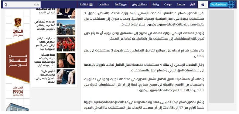 تتبع فريق عمل "تفنيد" تصريح القائم بأعمال وزير الصحة المصري، ووجد أنه "صحيحًا" ففي اليوم ذاته نفى الدكتور حسام عبد الغفار، المتحدث الرسمي باسم وزارة الصحة والسكان المصرية، في تصريح لموقع "مستقبل وطن نيوز"، تحويل 3 مستشفيات جديدة إلى مستشفيات عزل كاملة بعد زيادة حالات الإصابة بفيروس كورونا، مشيرًا إلى أن هناك زيادة ملحوظة في مُعدلات الإصابة المجتمعية لفيروس كورونا بنسبة تتراوح من 7% إلى 8%.